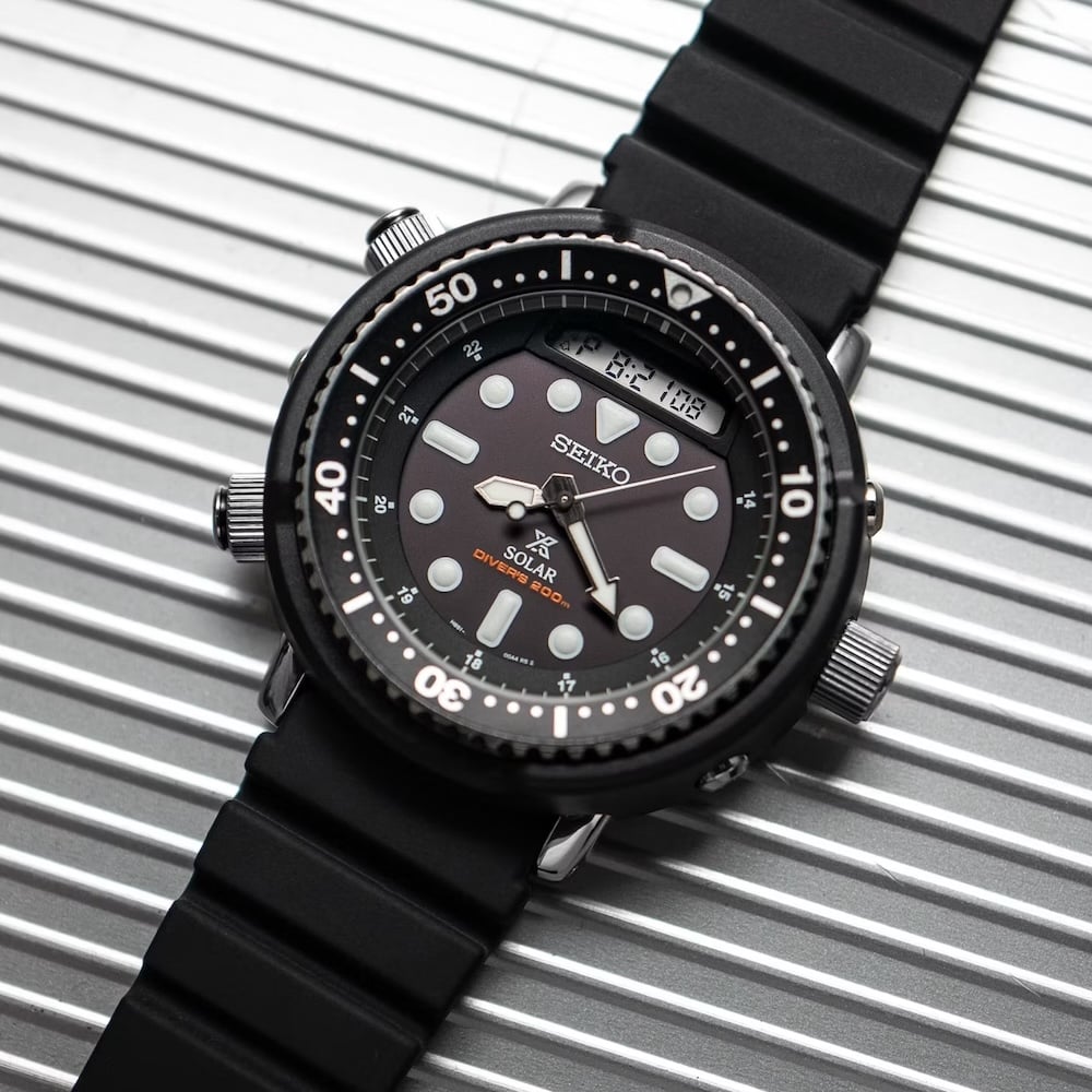 La Seiko Prospex SNJ025, sortie en 2019, est la réédition moderne de la fameuse ref H558-5009, rendue célèbre par Arnold Schwarzenegger dans les films d’action des années 80 : Commando (1985) et Predator (1987). D’où son surnom, “Arnie”. Cette SNJ025 propose un package complet pour l’aventurier en milieu hostile : double affichage (aiguilles et LCD), fonctions chronographe et alarme, étanchéité de 200 mètres, batteries solaires… rien n’y manque ! Ajoutez à cela des dimensions plus que généreuses (47mm de diamètre pour 14,4mm d’épaisseur), et vous obtiendrez une montre parfaite pour partir à la chasse aux extra-terrestres belliqueux. Prix : 449 €. Disponible ici >>>