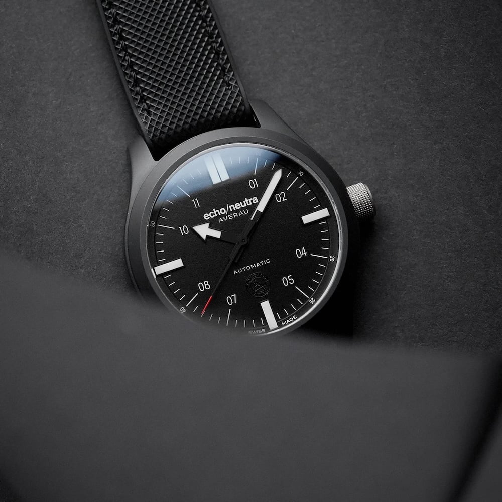 L’Averau Ceramic, c’est une tool-watch moderne, sans fioritures et tournée vers l’efficacité. Le boîtier noir de 42mm renferme un cadran noir mat, sur lequel s’ajoutent des index blancs et des aiguilles blanches, pour une lisibilité parfaite. Le choix des matériaux – titane et céramique – est également une promesse de légèreté et de résistance. Sous le capot, Echo/Neutra a choisi le mouvement automatique suisse Sellita SW200, synonyme de fiabilité et de précision. Et avec une étanchéité de 100 mètres, voilà donc une montre entièrement vouée à sa mission, jusque dans les moindres détails. Prix : 970 €. Disponible ici >>>