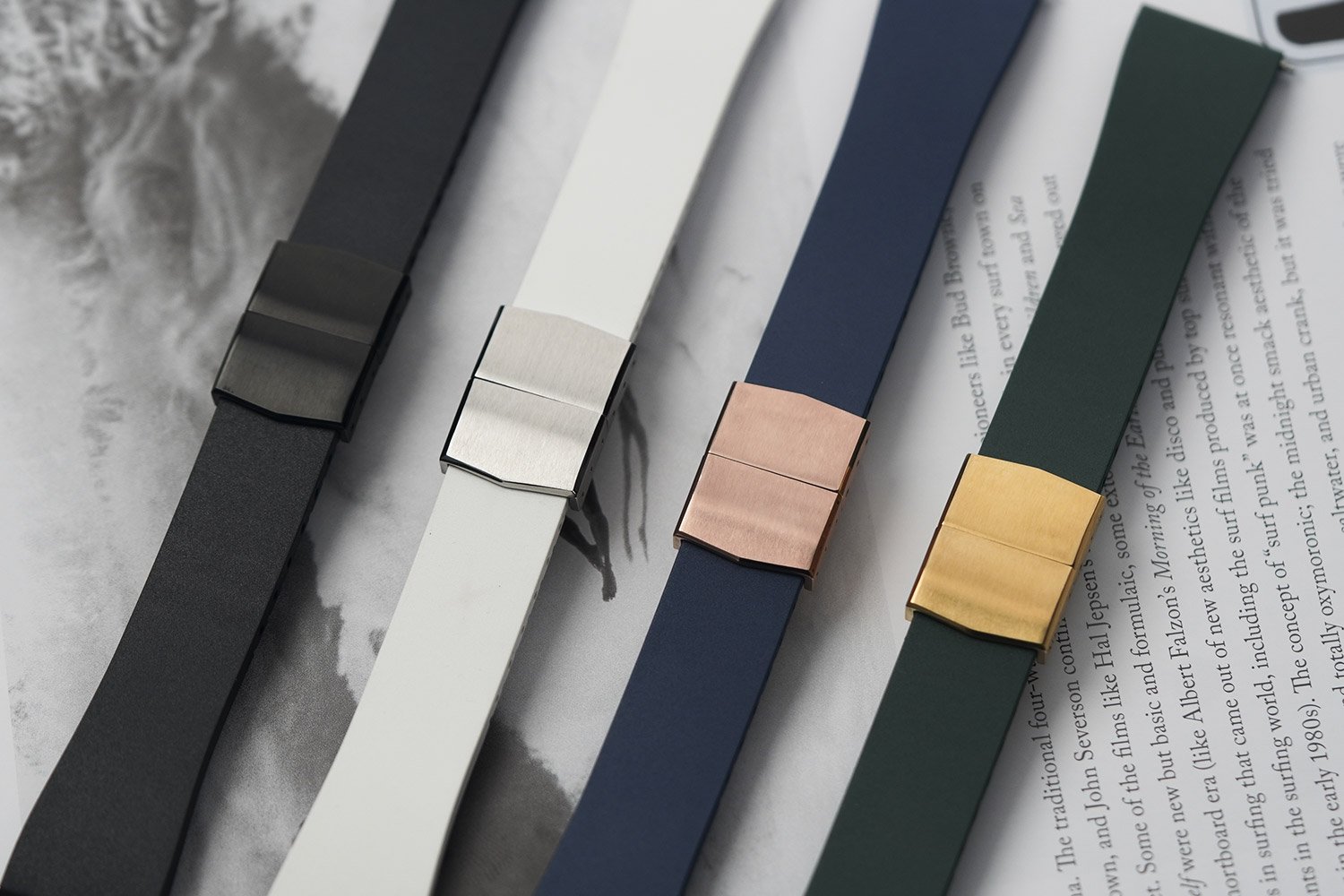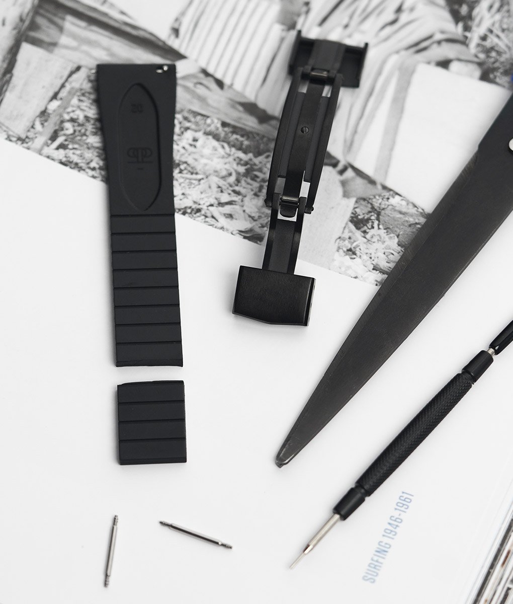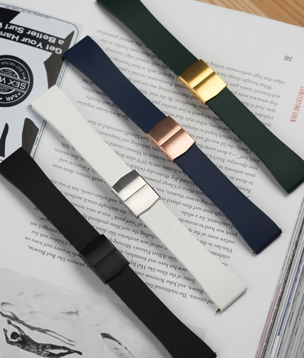 Le choix du caoutchouc FKM (abréviation Fluorine Kautschuk Material) de n’a rien d’anodin. Ce matériau, largement utilisé dans des environnements techniques exigeants, se distingue par sa résistance à l’eau, à la transpiration, aux UV et aux variations de température. En bref : ce matériau de la famille des fluoroélastomères est le meilleur caoutchouc sur le marché. Contrairement aux caoutchoucs plus classiques, le FKM conserve sa souplesse et son toucher dans le temps, sans durcir ni se dégrader. Au poignet, cela se traduit par une sensation dense mais confortable, parfaitement adaptée à un usage quotidien, y compris intensif.