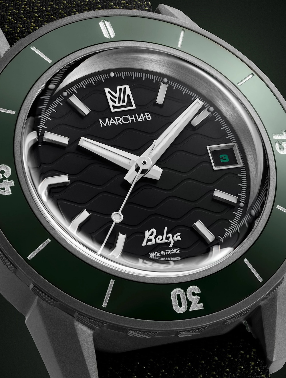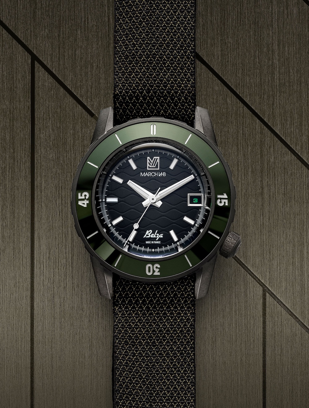 La Belza Titane est livrée sur un bracelet en jacquard vert kaki, tissé en France par la manufacture Julien Faure, établissement historique fondé en 1864 à Saint-Étienne. Grâce à un tissage navette traditionnel, les bracelets produits sont résistants, légers, confortables et amphibies — parfaits pour une montre pensée pour bouger. Il ne s’agit pas d’un simple accessoire, mais d’une dimension essentielle du projet Belza, soulignant encore une fois la volonté de March LA.B de produire le maximum en France, sans compromis.