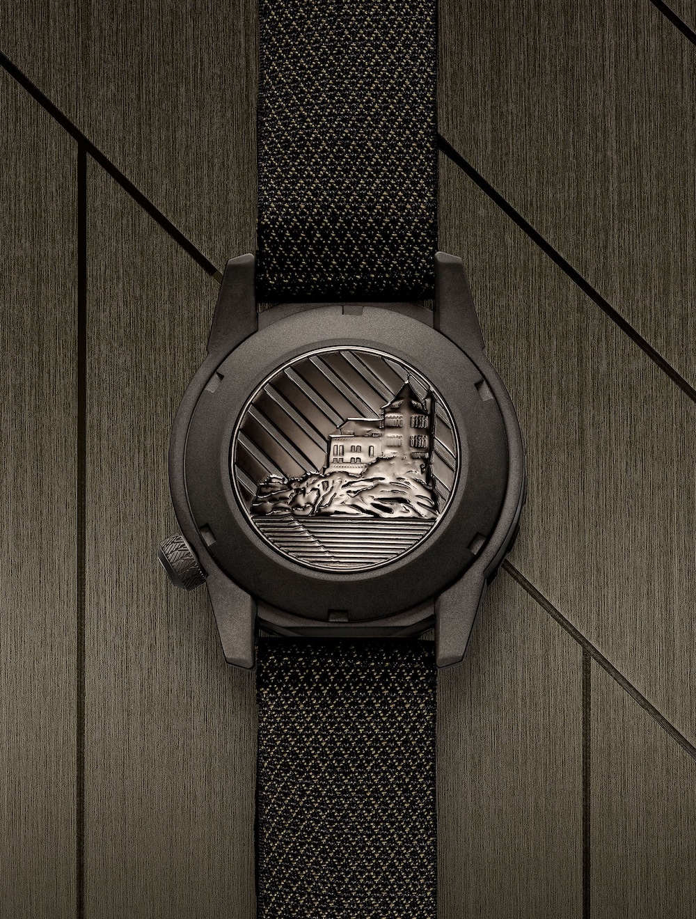 La silhouette de la Belza est immédiatement reconnaissable, mais cette version gagne en intensité grâce à un matériau qui change beaucoup de choses : le titane Grade 2. Le boîtier de 40 mm pour 47 mm de longueur et 14,5 mm d’épaisseur n’a jamais paru aussi cohérent. Son brossé mat, volontairement brut, est conçu pour se patiner avec le temps, un clin d’œil à la manière dont une planche de surf se marque de sessions successives, surtout avec des enfoncements causés par les nombreux canards (pour passer sous la vague). Le poids tombe à 71 g, un chiffre rare pour une montre aussi robuste, mais c’est aussi parce que son bracelet est léger. La lunette unidirectionnelle avec insert en céramique verte, 120 clics précis, ancre immédiatement ce modèle dans la culture March LA.B : le vert identitaire, profond et assumé. Le tout est étanche à 200 mètres, avec couronne vissée à 4 heures (limitant les frottements au poignet) et fond vissé gravé de la Villa Belza. C’est une montre construite pour les embruns, pour la sueur et pour le sel.