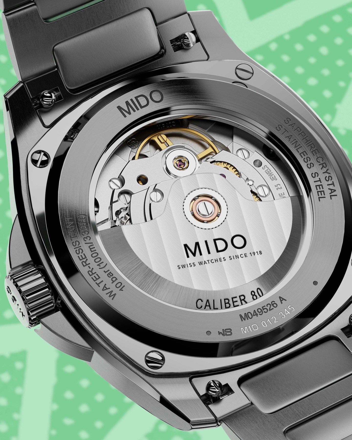 Le fond transparent dévoile une masse oscillante sobrement décorée de côtes de Genève, un détail qui rappelle que la montre appartient tout de même à un registre horloger légitime. L’ensemble est renforcé par une couronne vissée et une étanchéité de 100 mètres, un élément rarement associé à une montre au design si affirmé. Le contraste est réussi : derrière un cadran presque ludique se cache une architecture mécanique totalement pragmatique, démontrant que Mido a tout compris aux attentes des consommateurs.