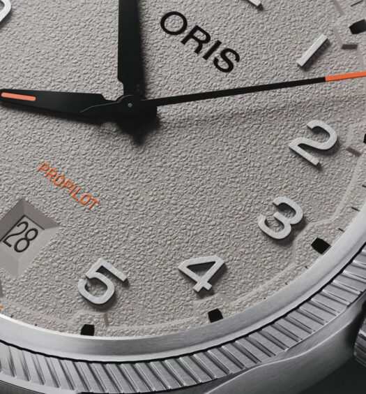 L’intégration d’une grande date à 12 h — élément emblématique du modèle — structure visuellement le cadran. La zone extérieure gris anthracite accentue l’effet “cadre d’écran” tout en accueillant des index en relief négatif. Ce mélange d’inspiration technique et d’exécution décorative donne naissance à une proposition originale : ludique, mais jamais fantaisiste. Le clin d’œil fonctionne parce qu’il est assumé, mais traité avec une rigueur suisse. Cette démarche rappelle la philosophie de certaines pièces neo-vintage réussies : reprendre une idée de l’époque analogique, mais l’intégrer dans les codes actuels de lisibilité, de lumière et de proportion.