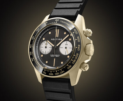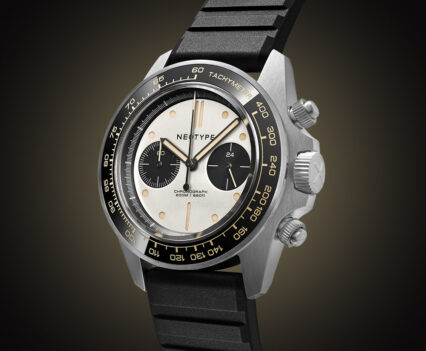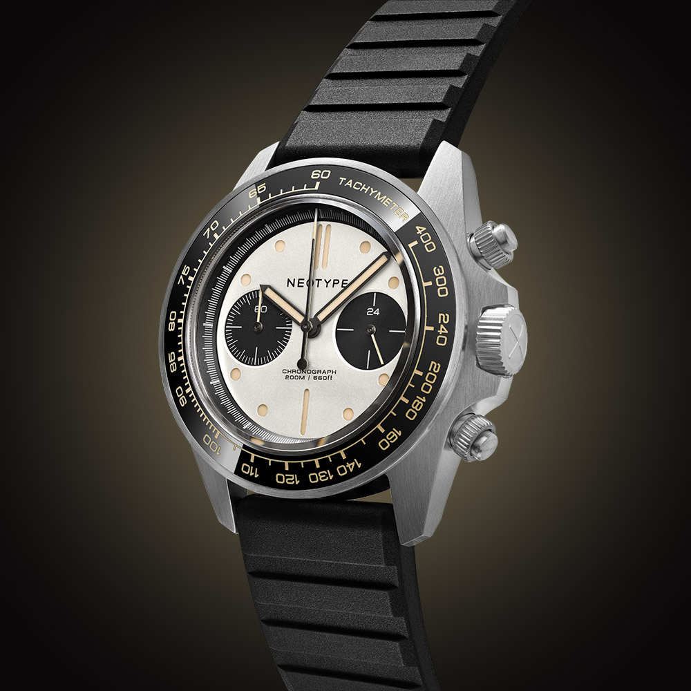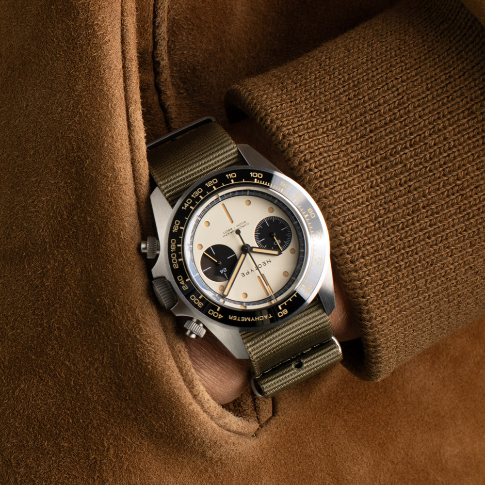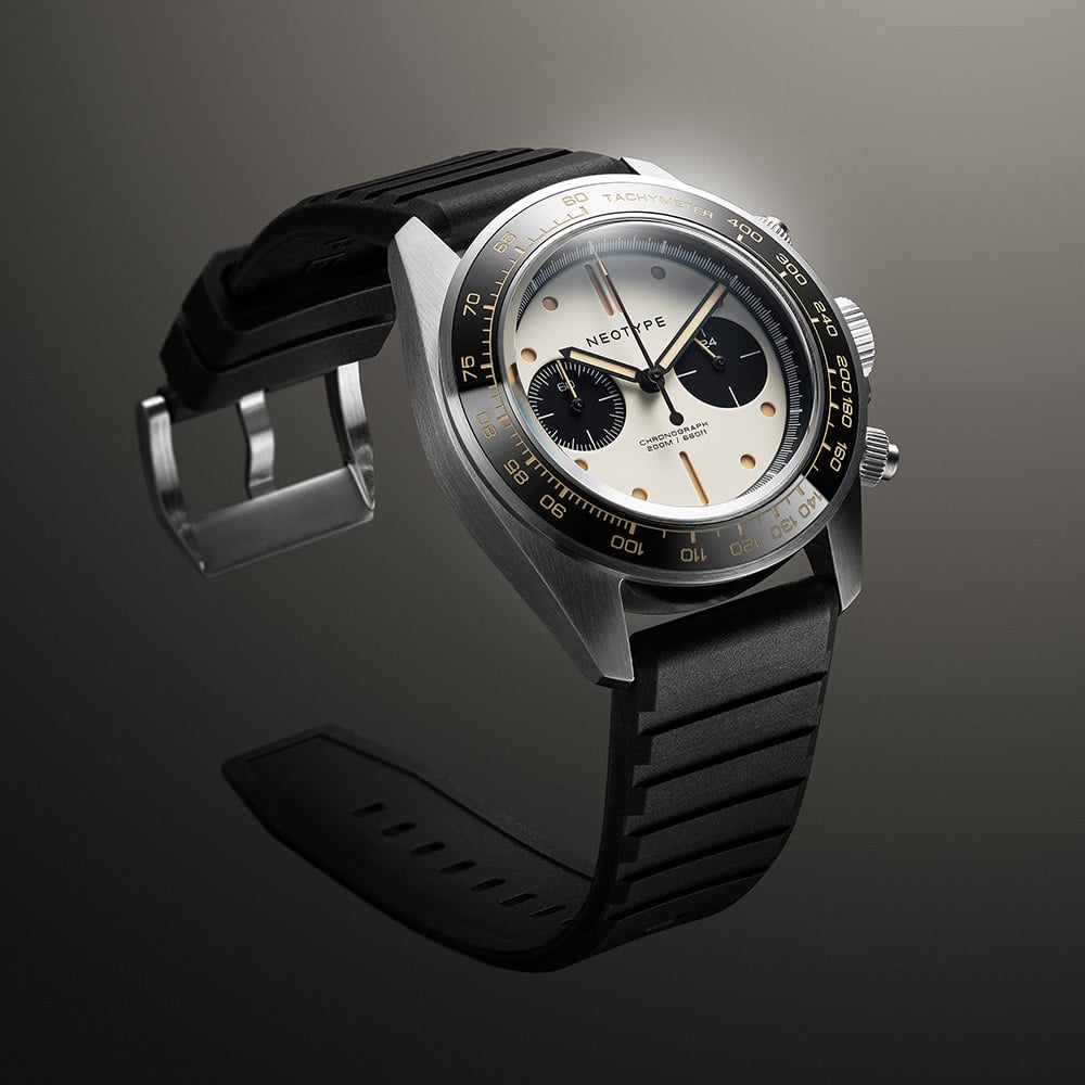 La version LM02C1AC dite « Panda » s’impose par son cadran crème clair, ses compteurs noirs et ses index couleur Old Radium, clin d’œil aux chronographes iconiques des années 60. Ce jeu de contrastes évoque immédiatement des modèles hérités de l’âge d’or de l’horlogerie sportive, tout en conservant une lecture moderne, limpide, et une finition irréprochable. Le boîtier en acier inoxydable 316L brossé reste fidèle à l’ADN de la LM02 : diamètre de 39 mm (48,5 mm de corne à corne), épaisseur de 13,80 mm (verre inclus). La lunette en céramique polie, autre nouveauté de ces « Type C », confère un léger twist habillé sans dépasser la sobriété de l’ensemble. Avec cette déclinaison, Neotype réussit le pari de combiner le charme vintage et la portabilité quotidienne pour offrir un équilibre plus subtil.