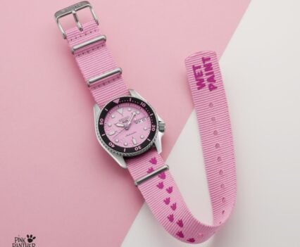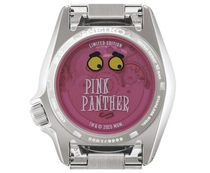 L’édition Pink Panther, référence SRPM07K1, détourne avec malice l’iconique Seiko 5 Sports en une édition limitée à 9 999 exemplaires, où un cadran rose vif ponctué d’empreintes de pattes évoque le célèbre félin animé tout en conservant l’esprit robuste et sportif de la ligne la plus abordable de la maison nippone. Animée par le calibre automatique 4R36 offrant environ 41 heures de réserve de marche et protégée jusqu’à 100 mètres d’étanchéité, cette création joue la carte du storytelling pop, proposant une pièce originale mais aussi très féminine. Prix : 460 €. Disponible ici >>>