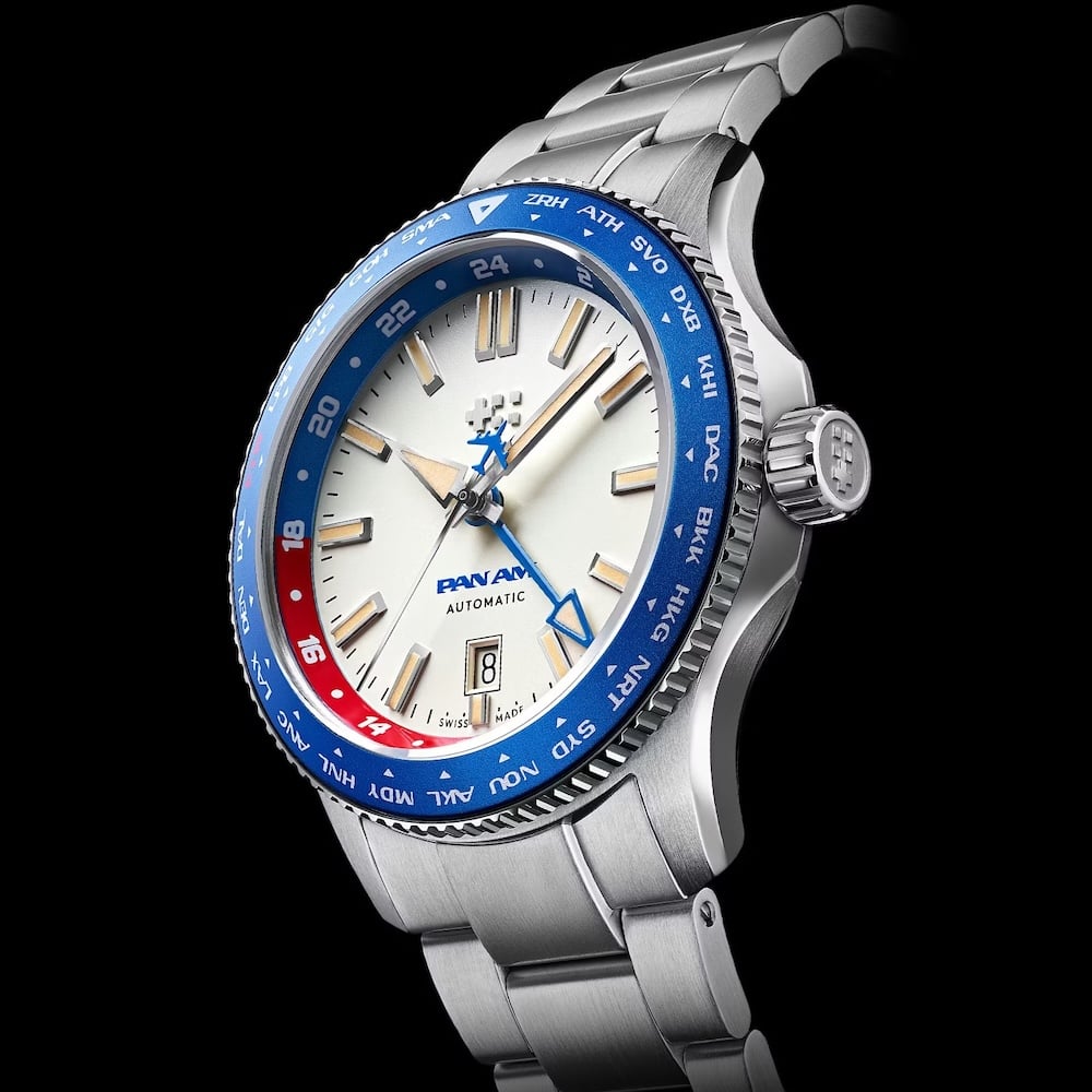 Pensée comme un hommage au voyage transatlantique, cette GMT s’inscrit dans un récit précis : celui de Christopher Ward et de son partenariat avec la Pan American World Airways, pionnière du vol commercial à réaction dès 1958. Baptisée C60 Clipper GMT, elle fait référence au Boeing 707 Clipper America, jusque dans ses détails symboliques, de la série limitée à 707 pièces à la date bleue le 26. Boîtier “Light-Catcher” de 42 mm, lunette worldtimer à codes aéroportuaires et calibre Sellita SW330-2 GMT composent une montre cohérente, narrative et techniquement sérieuse, proposée autour de 1 895 €. Une pièce qui raconte le voyage sans tomber dans le pastiche…mais déjà épuisée.
