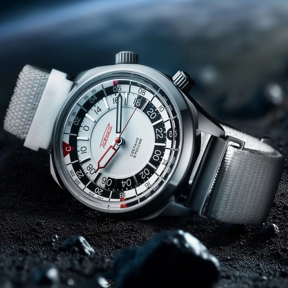 Conçue comme un véritable instrument spatial, cette nouveauté célèbre un double anniversaire : les 65 ans du premier vol habité de Yuri Gagarine et les 65 ans de Raketa, fondée la même année. Cette Baikonur adopte une lecture sur 24 heures, essentielle hors du cycle jour/nuit et donc dans l’espace, associée à une lunette interne mêlant boussole périphérique et second fuseau calé sur le GMT de l’ISS. Animée par le calibre manufacture 2624CA précis à -10/+20 secondes par jour et doté de 40 heures de réserve de marche, elle affiche une cohérence fonctionnelle totale, le tout proposé à 2 400 €.