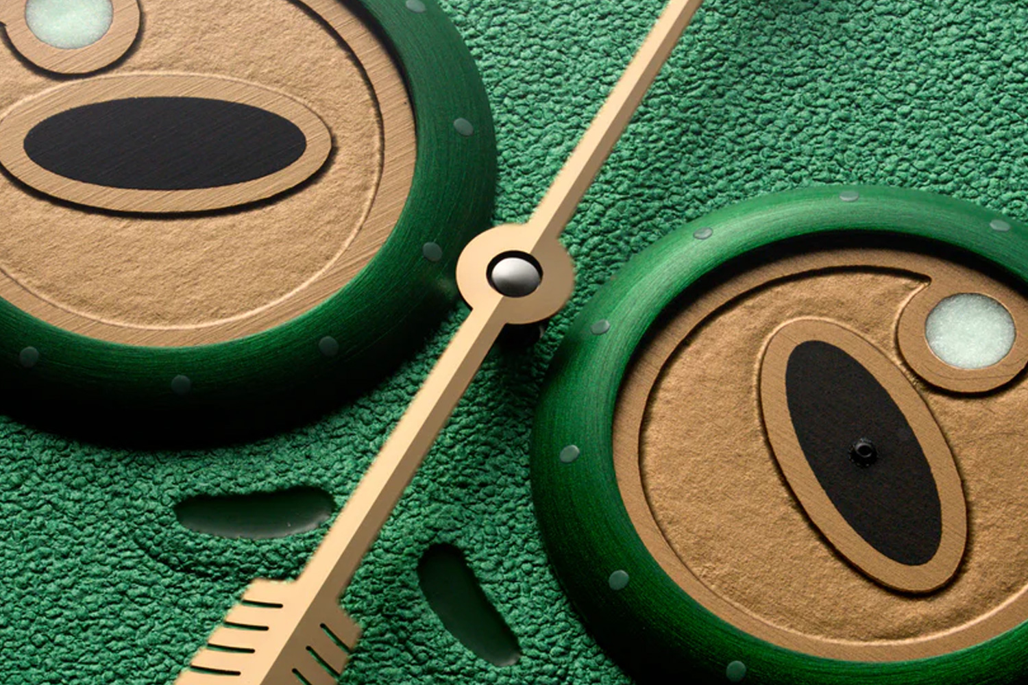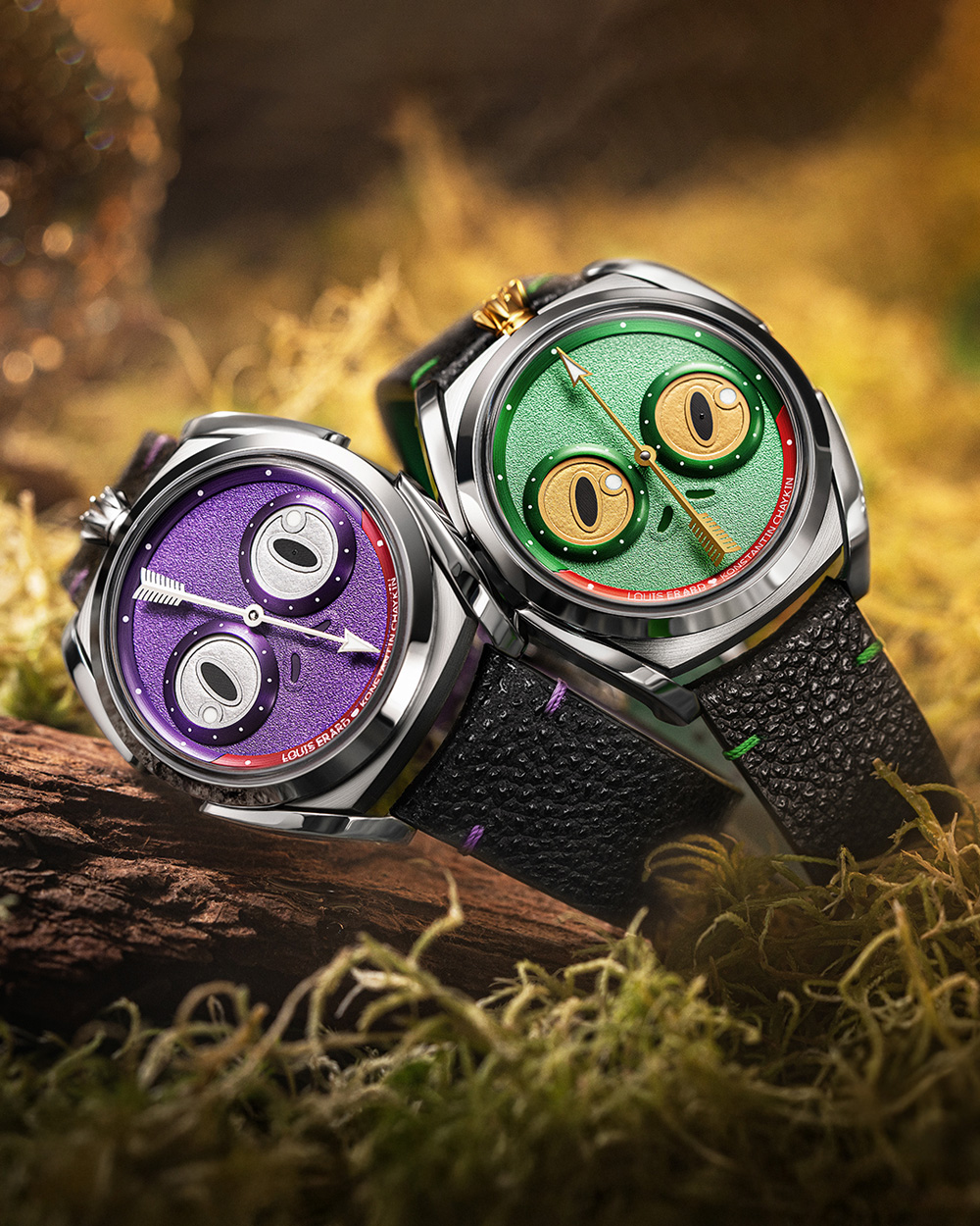 Avec l’Unfrogettable, Louis Erard et le maître horloger russe Konstantin Chaykin réinventent le régulateur traditionnel en un duo de montres aussi espiègles que techniques, inspirées du folklore de la grenouille et du vocabulaire visuel des “Wristmons” de Chaykin. Logées dans un boîtier de 40 mm en titane grade 5 brossé-poli, ces éditions limitées à 178 pièces par couleur adoptent un affichage régulateur horizontal où les disques des heures et des secondes deviennent les “yeux” du personnage, tandis que la partie inférieure rouge du rehaut compose sa “bouche”, créant un visage ludique mais ingénieux sur le cadran vert ou violet.