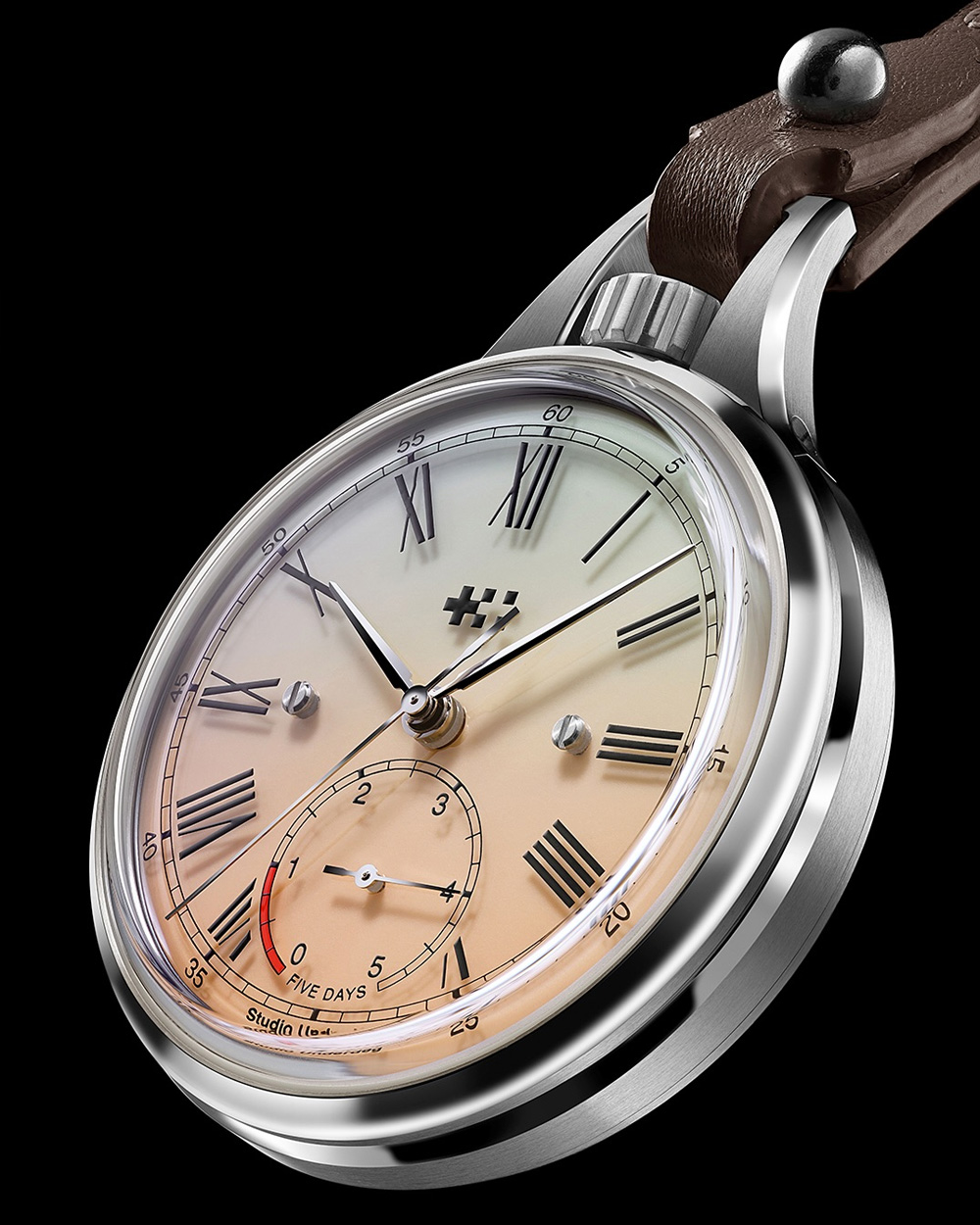 Après H. Moser & Cie, Fears et Massena LAB, Studio Underd0g collabore avec Christopher Ward pour bousculer les conventions. Avec The Alliance 02, les deux maisons font revivre le format de la montre de poche pour le XXIᵉ siècle, alliant toute l’excentricité avec le savoir-faire horloger britannique. Limité à seulement 100 pièces, ce modèle surprenant repose sur un boîtier acier de 44 mm inspiré du design Light-catcher de Christopher Ward, dont les surfaces polies et brossées captent la lumière, surplombé par une grande couronne à 12 h comme sur les garde-temps d’antan. Le cadran à double couche combine une base en laiton avec sept couches de Super-LumiNova — du blanc cassé à l’orange pêche — et un disque en verre saphir imprimé de chiffres romains suspendus, offrant une profondeur visuelle inédite à ce format.