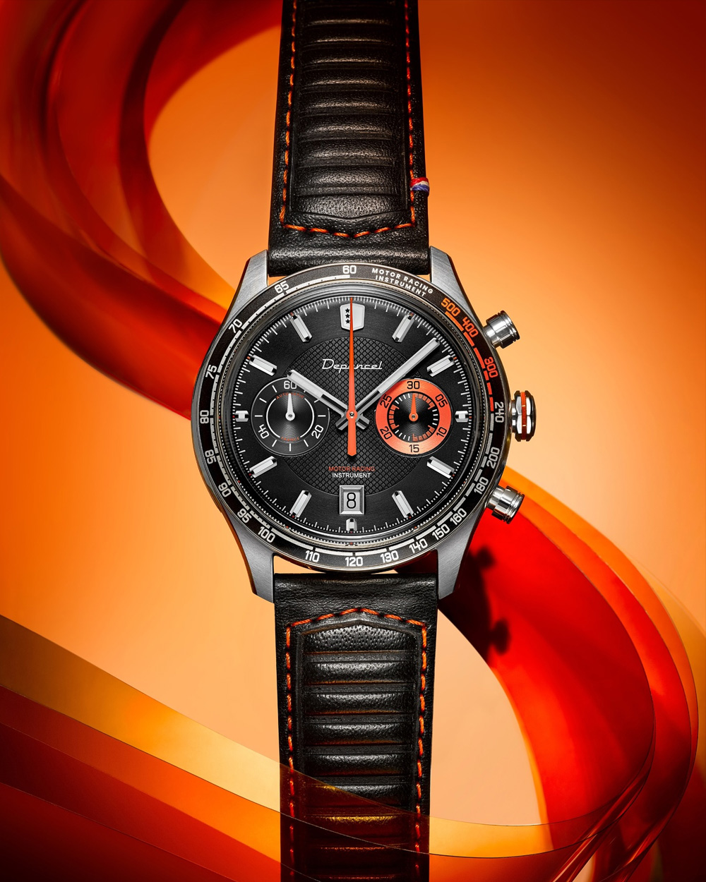 Cette nouvelle montre signée Depancel réinterprète l’esprit des chronographes automobiles des années 60-70 avec une personnalité sportive et colorée, pensée comme un véritable instrument de bord inspiré des compteurs de piste. Son boîtier acier de 43 mm abrite un mouvement automatique suisse, calibre ETA 7753, offrant fonctions chronographe et date avec environ 54 h de réserve de marche, le tout visible via un fond transparent, tandis que l’échelle tachymétrique sur la lunette en aluminium et les touches orange apportent un style racé.