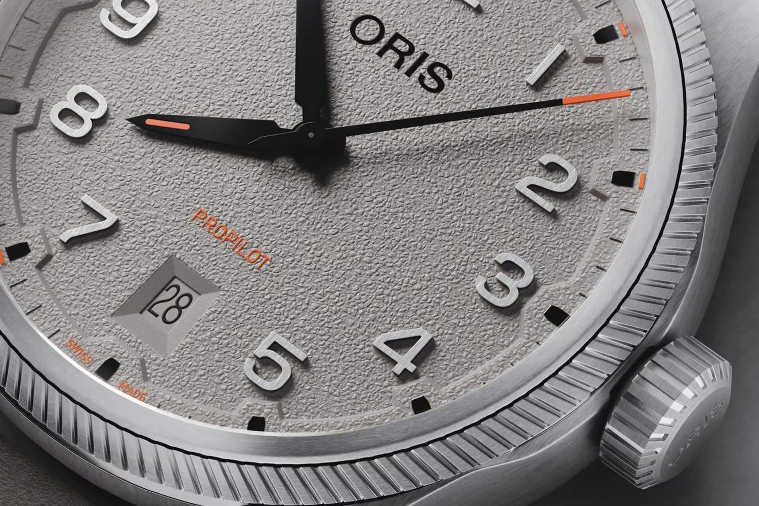 Depuis la sortie de la ProPilot X Calibre 400, Oris a hissé les standards esthétiques et techniques de sa gamme aéronautique. Le design sculptural en titane, la réserve de marche de 5 jours, l’architecture contemporaine : tout cela a changé la perception de ce qu’une ProPilot pouvait être. La nouvelle version Date s’inscrit dans cette nouvelle ère sans chercher à rivaliser. Elle en reprend la rigueur visuelle — typographie plus instrumentale, cadran épuré, lisibilité accrue — mais reste volontairement simple.