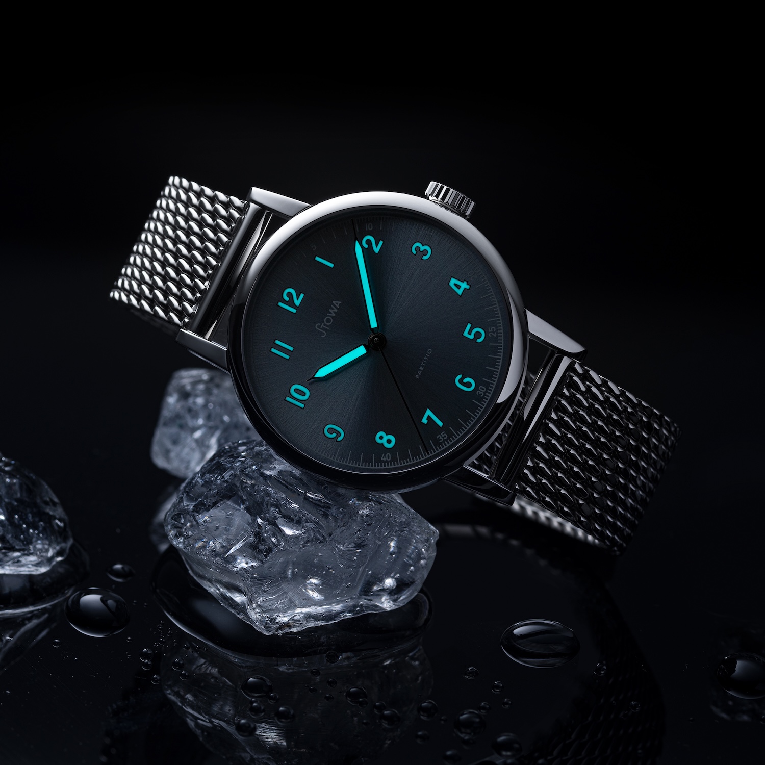 Le cadran de cette Partitio Ice Blue joue la carte de la sobriété fonctionnelle chère à la marque. Les aiguilles nickelées et les index luminescents jonchés de Super-LumiNova BGW9 assurent une lisibilité parfaite, même dans la pénombre hivernale. L’ensemble évoque une forme de calme et de pureté, à mi-chemin entre l’instrument scientifique et l’objet de style. Le choix du bracelet — en cuir noir Walknappa au grain fin ou en acier à maille milanaise polie — vient parfaire cette élégance minimaliste.
