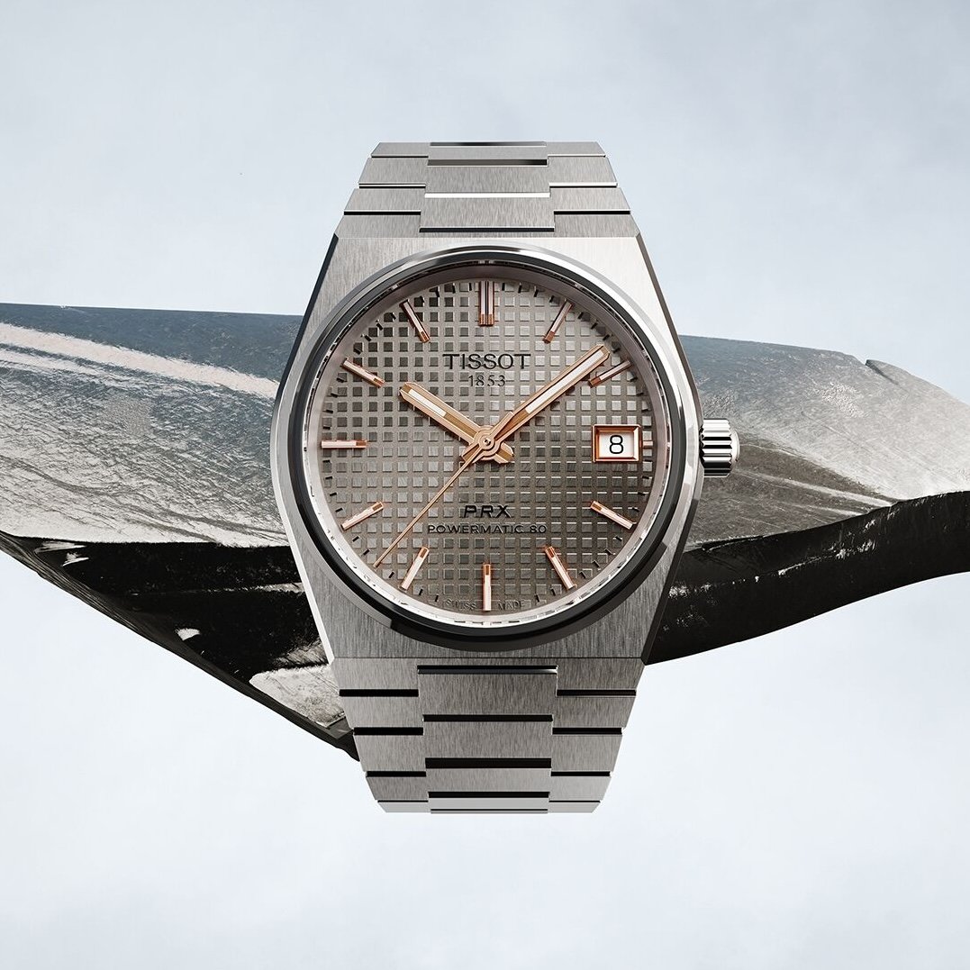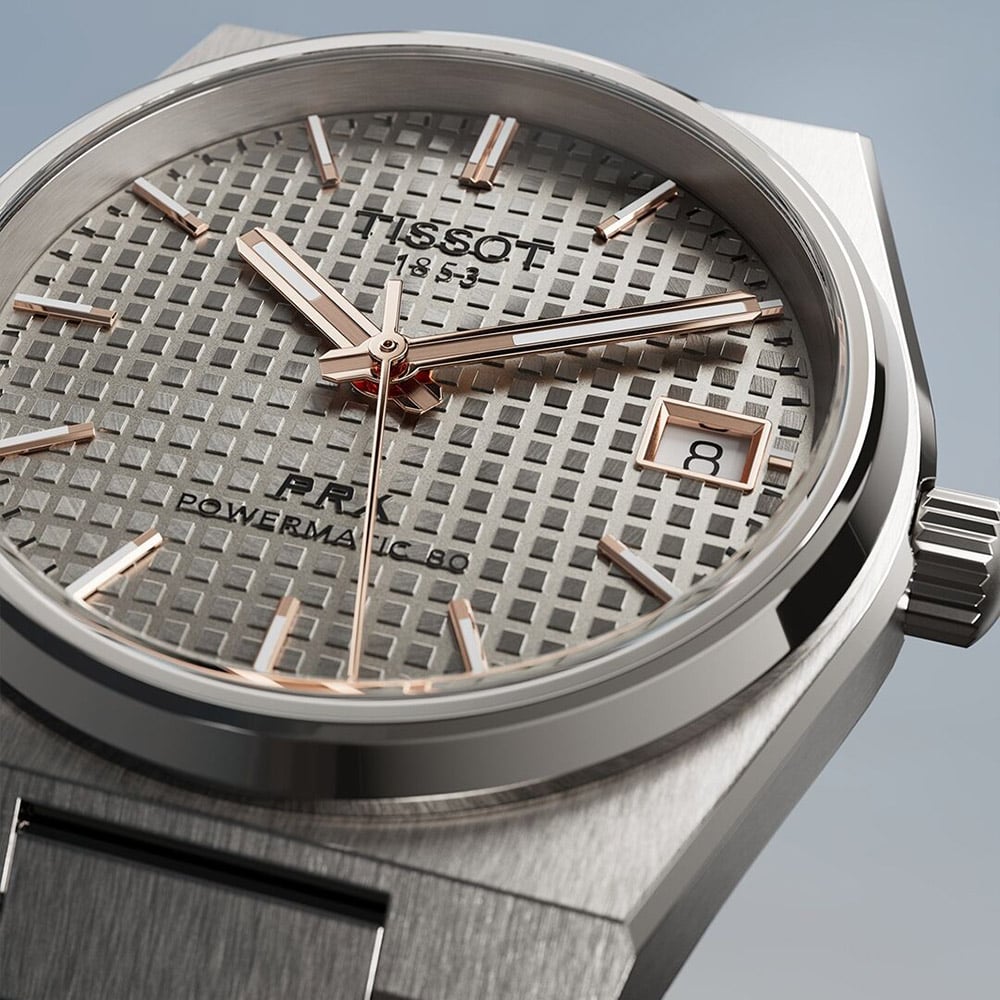 Sous le capot, la PRX 38 mm abrite un mouvement automatique Powermatic 80 offrant une réserve de marche de 80 heures. Son spiral en Nivachron garantit une excellente résistance aux champs magnétiques, tandis que l’ensemble reste étanche à 100 mètres. Le cadran, protégé par un verre saphir antireflet, affiche des index bâtons appliqués, une date à 3 h puis des aiguilles facettées polies et jonchées de Super-LumiNova. L’ensemble conserve l’esprit d’origine de la PRX, née pour être fine, précise et robuste, tout en intégrant les standards techniques de 2025.