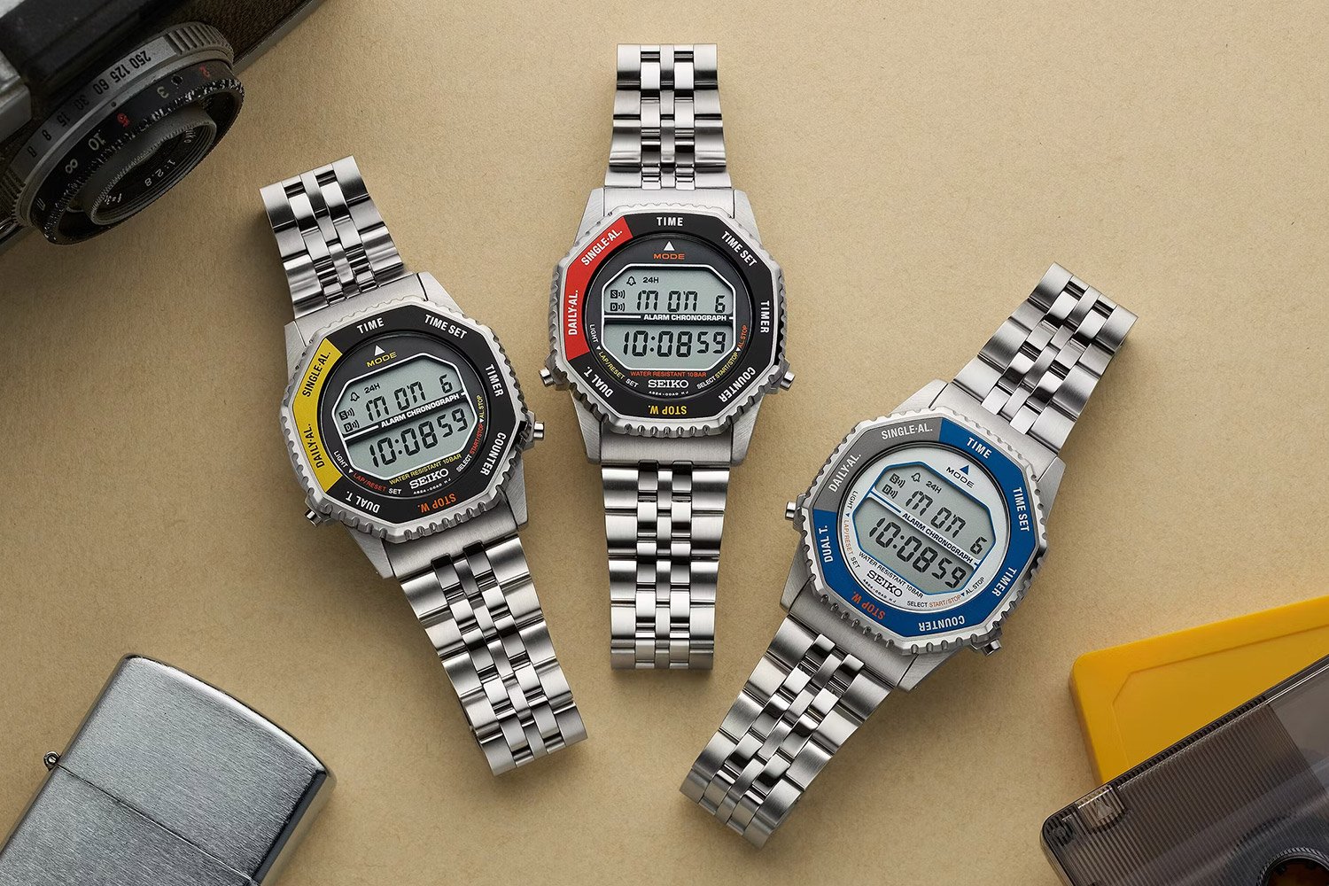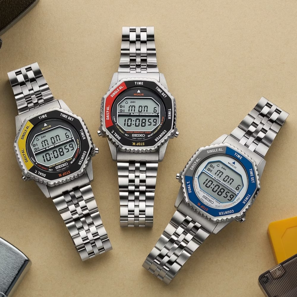 Comme souvent avec Seiko, la Rotocall se décline en trois variantes colorées : la SMGG17P1 (lunette jaune/noir), la SMGG19P1 (rouge/noir) et la SMGG21P1 (gris/bleu). Le cadran digital à affichage deux secteurs reste fidèle à l’esprit 80s, tandis que le bracelet acier cinq-maillons assure une touche vintage assumée…même si elle nous donne aussi envie de jouer avec ses couleurs sur un bracelet NATO. La silhouette anguleuse évoque les codes de l’ère “ordinateur de bord”, sans jamais tomber dans la caricature. Cette montre joue la carte de la finesse plutôt que celle du gadget, et c’est justement ce qui la rend si désirable.