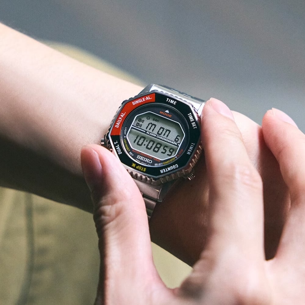 Avec cette réédition, Seiko ne cherche pas à tout révolutionner mais à rester fidèle à l’esprit d’origine tout en l’ajustant aux attentes du monde d’aujourd’hui. Le boîtier en acier mesure 37 mm de diamètre, pour une épaisseur de 10,6 mm et une longueur de 43,5 mm. Il est donc compact et tout à fait portable par tout le monde vu son caractère afin d’éviter l’effet “poignet géant”. Le verre est en Hardlex, tandis que l’étanchéité monte à 100 mètres — un sérieux upgrade par rapport à certaines digitales vintage. Le mouvement embarqué est le calibre quartz A824, avec une précision d’environ ±20 secondes par mois et une fiabilité dont on ne doute même pas connaissant Seiko.