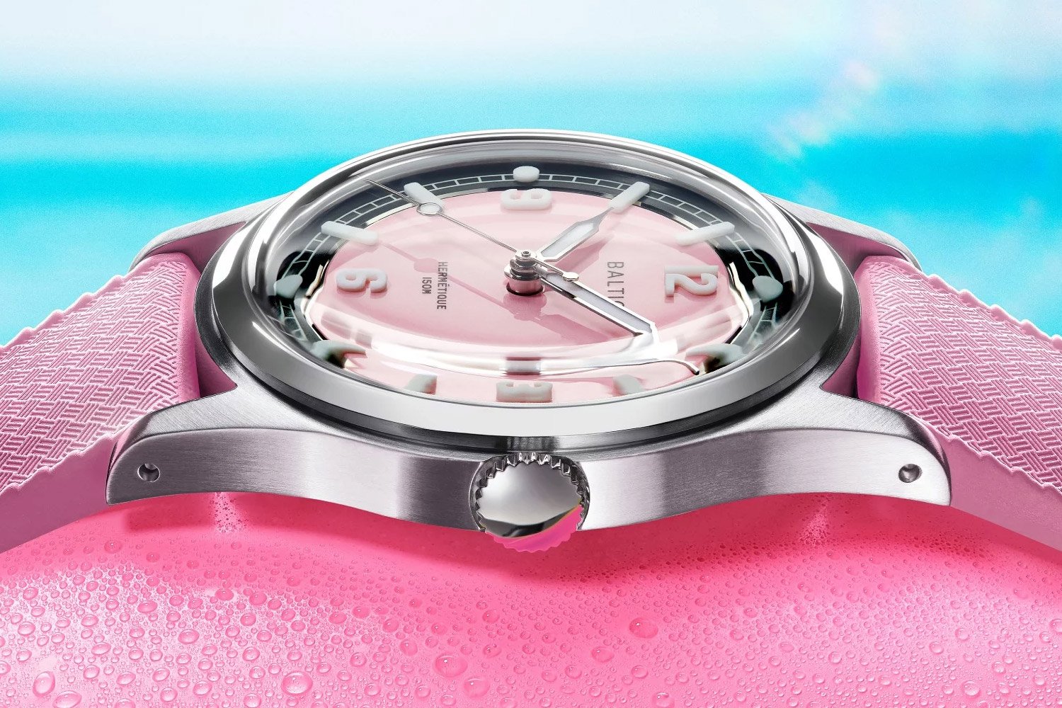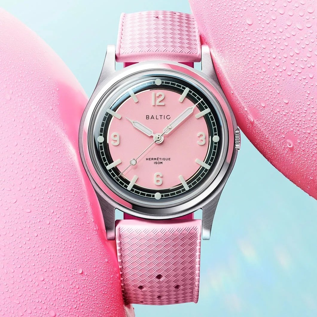 La Baltic Hermétique Summer Rose réinterprète avec finesse l’esthétique des montres de terrain en lui donnant une teinte rose estivale qui ne sacrifie rien à la lisibilité. Son cadran à secteur, cerclé de lames d’acier, met en valeur des index appliqués faits de Super-LumiNova et des aiguilles également jonchées de cette même matière pour offrir une excellente visibilité en tout temps. Logée dans un boîtier inspiré des années 1960 avec une étanchéité poussée à 150 mètres, cette pièce allie personnalité chromatique et vocation de baroudeuse, apportant une énergie unique et surtout très cool. C’est un second coup de coeur pour nous. Prix : 660 €. Disponible ici >>>