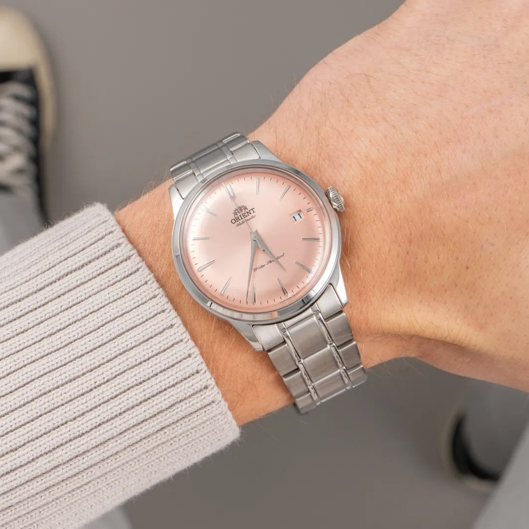 Le charme classique trouve une résonance inattendue sur le cadran rose de l’Orient Bambino 38 mm (référence RA-AC0M11Y), qui capte la lumière avec une douceur presque vintage. Sans renier ses racines traditionnelles, son boîtier à la carrure fine, parfaitement poli encadre un cadran épuré ponctué d’aiguilles dauphines et d’index appliqués, conférant une lisibilité efficace et raffinée. Ce modèle incarne une élégance accessible, démontrant qu’une montre de 38 mm peut allier personnalité chromatique et identité horlogère affirmée, une combinaison qui enrichit naturellement cette sélection. Prix : 299 €. Disponible ici >>>