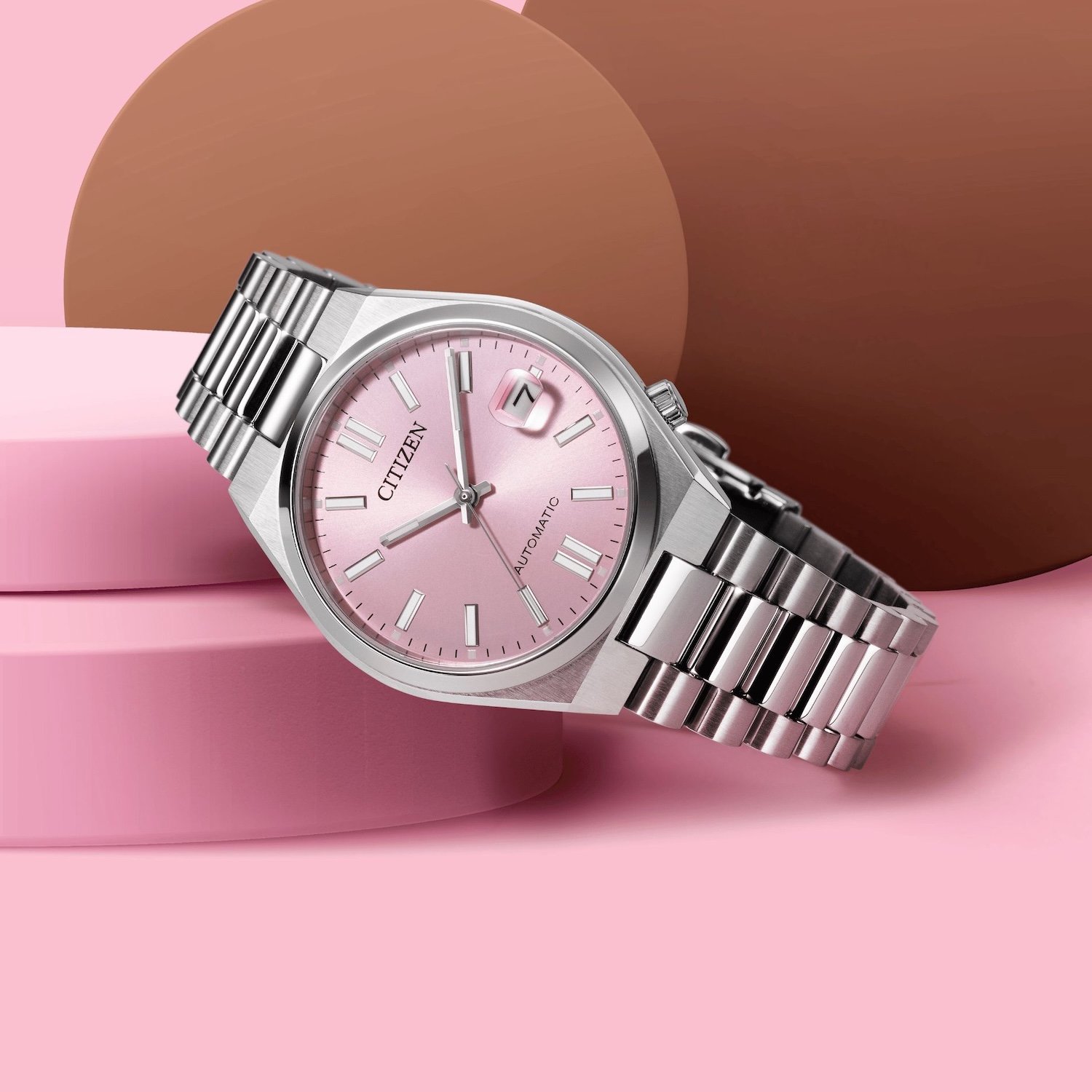 Sous un format contenu, la Citizen Tsuyosa 37 mm (référence NJ0200-50Z) arbore un cadran rose délicatement brossé qui évolue subtilement selon l’angle de la lumière, enrichi par une loupe cyclope, une fine trotteuse et des index appliqués nets jonchés de matière luminescente. Animée par un mouvement automatique maison, cette tocante japonaise offre une présence élégante, tout en conservant une épaisseur mesurée qui la rend aussi confortable au poignet que facile à porter au quotidien. C’est une interprétation du rose qui reste discrète, sophistiquée et cohérente. C’est un de nos coups de coeur ! Prix : 299 €. Disponible ici >>>