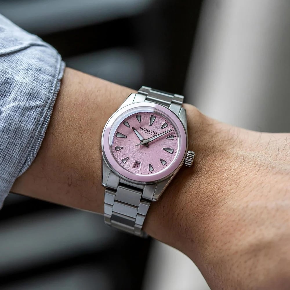 La Nodus Unity Blossom Pink joue avec le rose d’une manière quasi-inédite, très loin des pastels superficiels, en lui donnant du relief grâce à une finition soleillée profondément estampée créant une texture saisissante. L’inspiration : l’iris notre oeil ainsi que de la beauté naturelle de la nature de manière plus générale. Son boîtier de taille contenue, soit 36,5 mm, et son profil fin de 11,3 mm (verre inclus), associés à un mouvement automatique japonais éprouvé, lui confèrent une présence à la fois moderne et équilibrée. Chaque détail témoigne d’une approche horlogère réfléchie et authentique. Prix : 532 € (HT). Disponible ici >>>