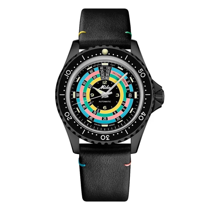 Revenons chez nos chers amis de Mido avec une édition limitée très récente et livrée avec un trio de bracelets : acier noir, caoutchouc bleu et cuir aux coutures italiennes colorées qui lui donnent tous un style se mariant parfaitement avec son cadran coloré indiquant les paliers de décompression. C’est une vraie plongeuse, étanche à 200 mètres, mêlant un style vintage avec une construction et un style très modernes, pour habiller les poignets de ceux en quête d’une montre de plongée singulière. Le tout mesure 40,5 mm de largeur et renferme un mouvement automatique offrant 80 heures d’autonomie. Prix : 1 053 € (1 620 €). Disponible ici >>>