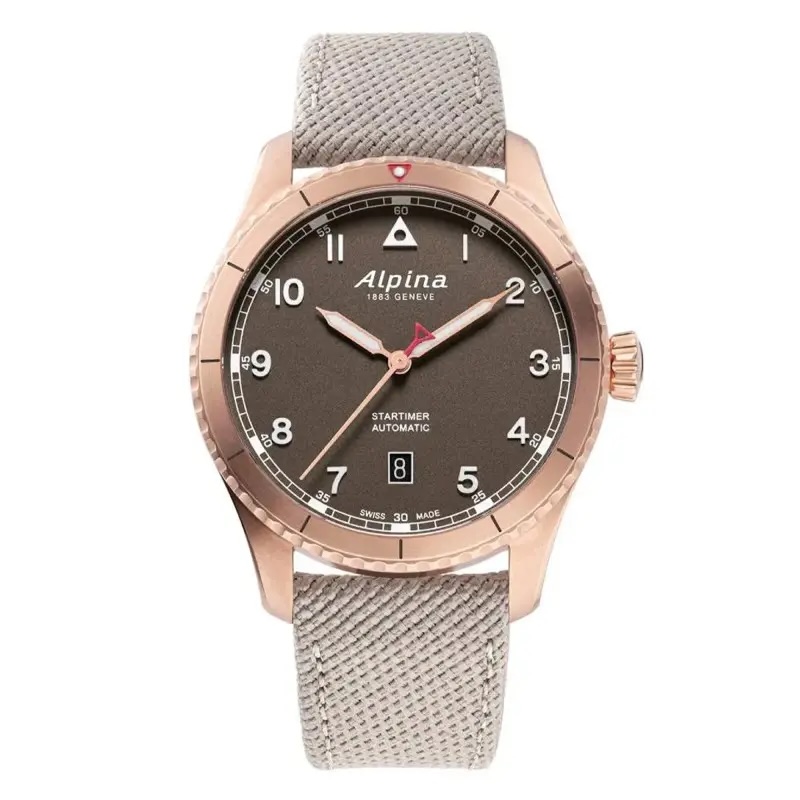Revenons chez nos cousins helvétiques, cette fois-ci chez Alpina. Ce modèle de la collection phare de la maison de Plan-les-Ouates, affiche un style plus clinquant d’un genre presque nouveau que nous appellerons baroudeur-chic ! Au menu : boîtier de 41 mm couleur or rose, cadran marron mat, puis bracelet en RPET (plastique recyclé) qui vient logiquement habiller cette pièce étanche à 100 mètres. C’est peut-être audacieux, mais on adore ! Prix : 932 € (1 695 €). Disponible ici >>>