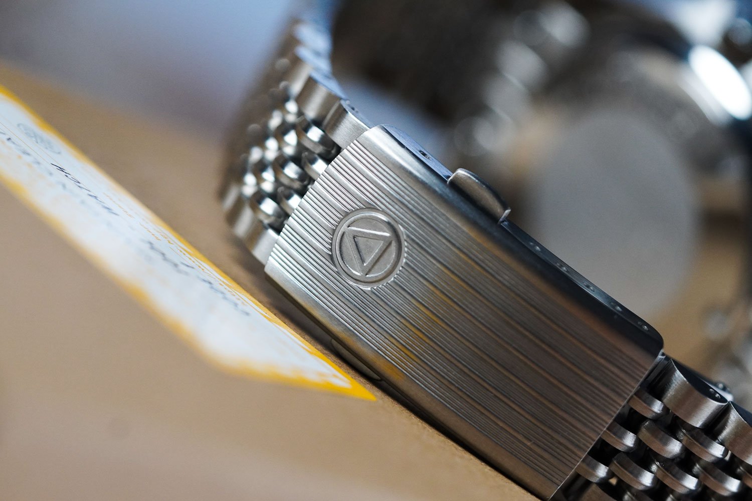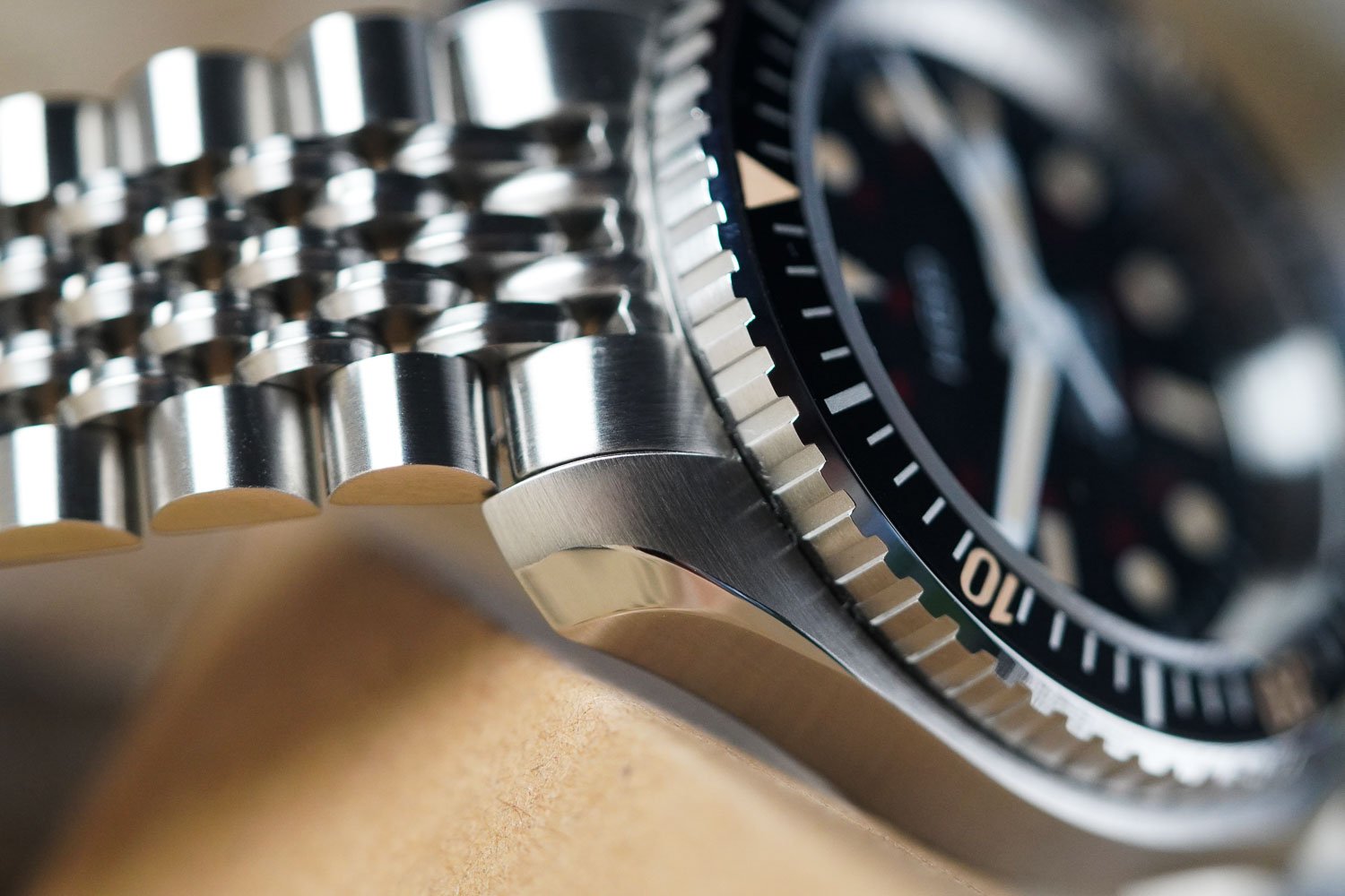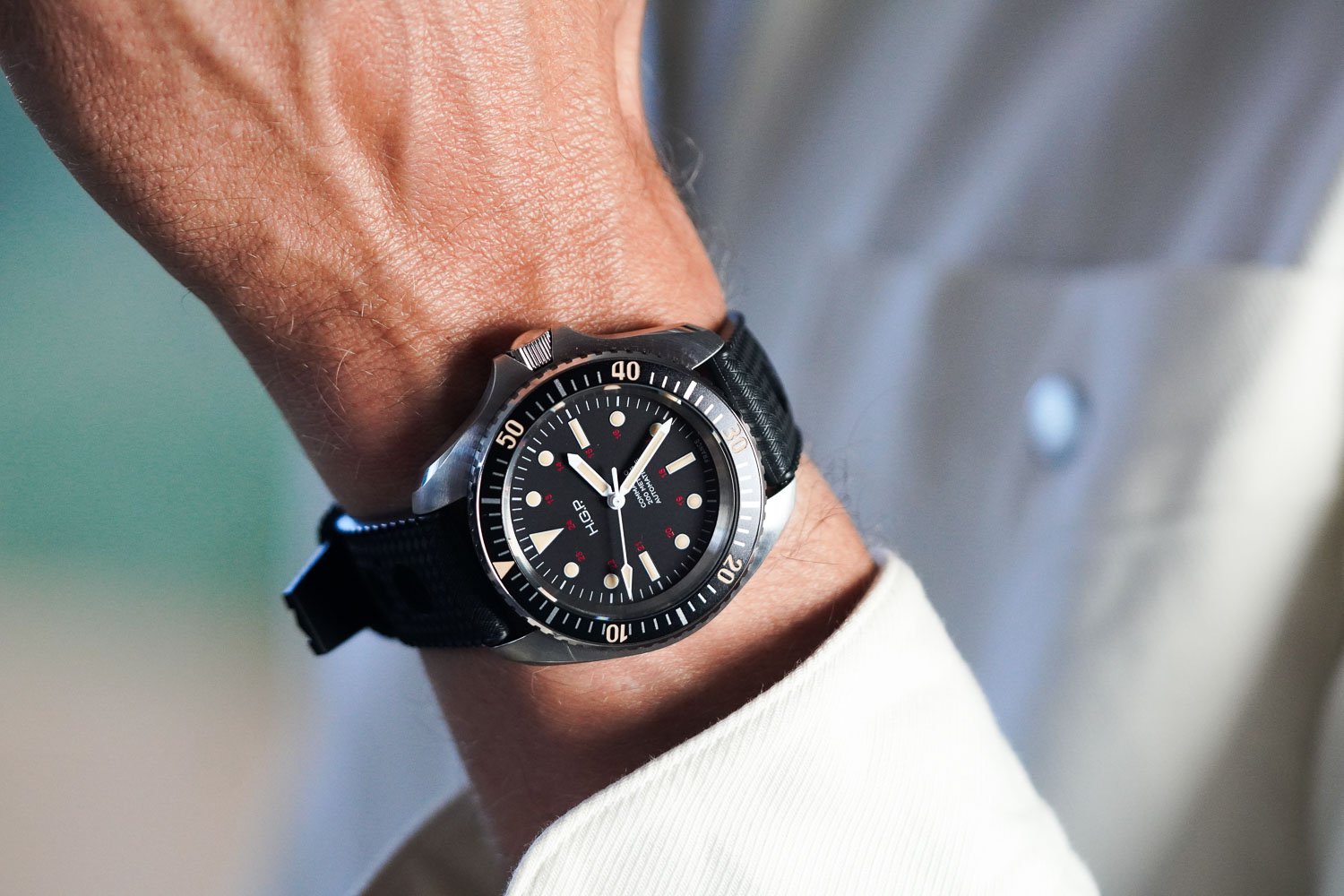 Au poignet, la montre séduit par sa présence équilibrée et son confort. Le bracelet grains-de-riz brille par sa qualité d’exécution : les maillons centraux acérés apportent un relief séduisant, tandis que la boucle déployante striée évoque l’esprit vintage de la montre. En alternative, HGP propose un bracelet Tropic en caoutchouc, idéal pour les activités aquatiques comme pour les beaux jours.