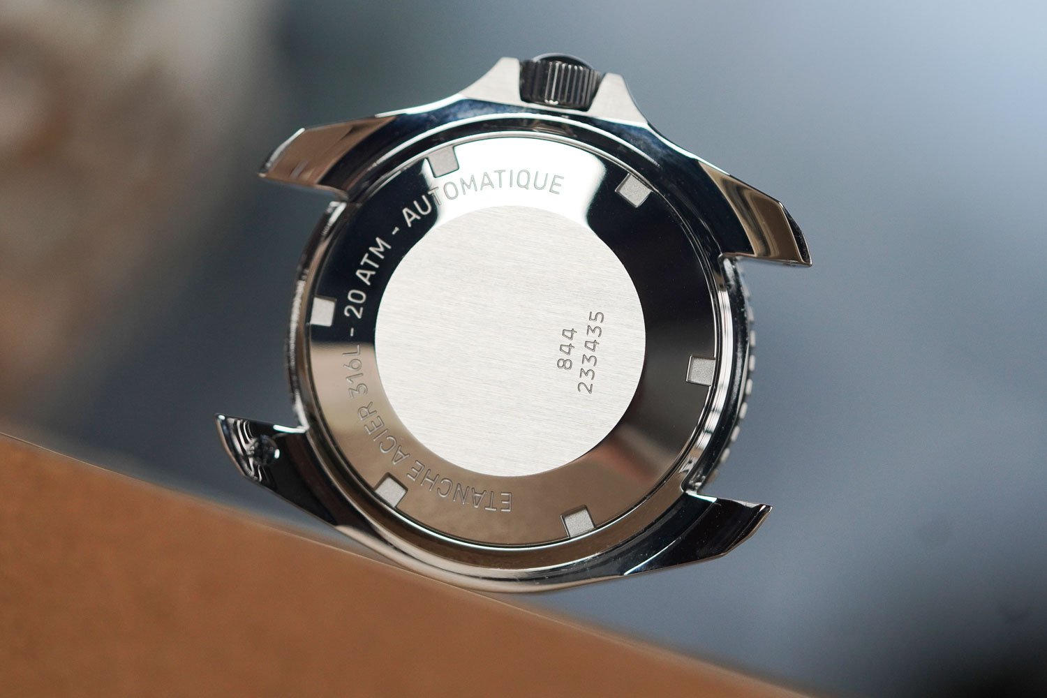 Sous son verre saphir plat, le cadran noir mat dégage un charme vintage renforcé par des index et aiguilles au Super-LumiNova “Old Radium” couleur coquille d’oeuf, offrant une excellente lisibilité, de jour comme de nuit. La lunette unidirectionnelle en acier, dotée d’un insert aluminium noir, arbore elle aussi des marqueurs luminescents puis tourne avec fermeté et sans jeu. Et avec son étanchéité de 200 mètres, cette montre est taillée pour la mer comme pour la ville.