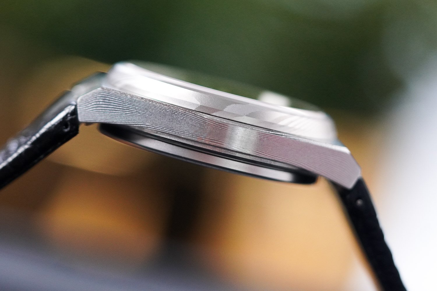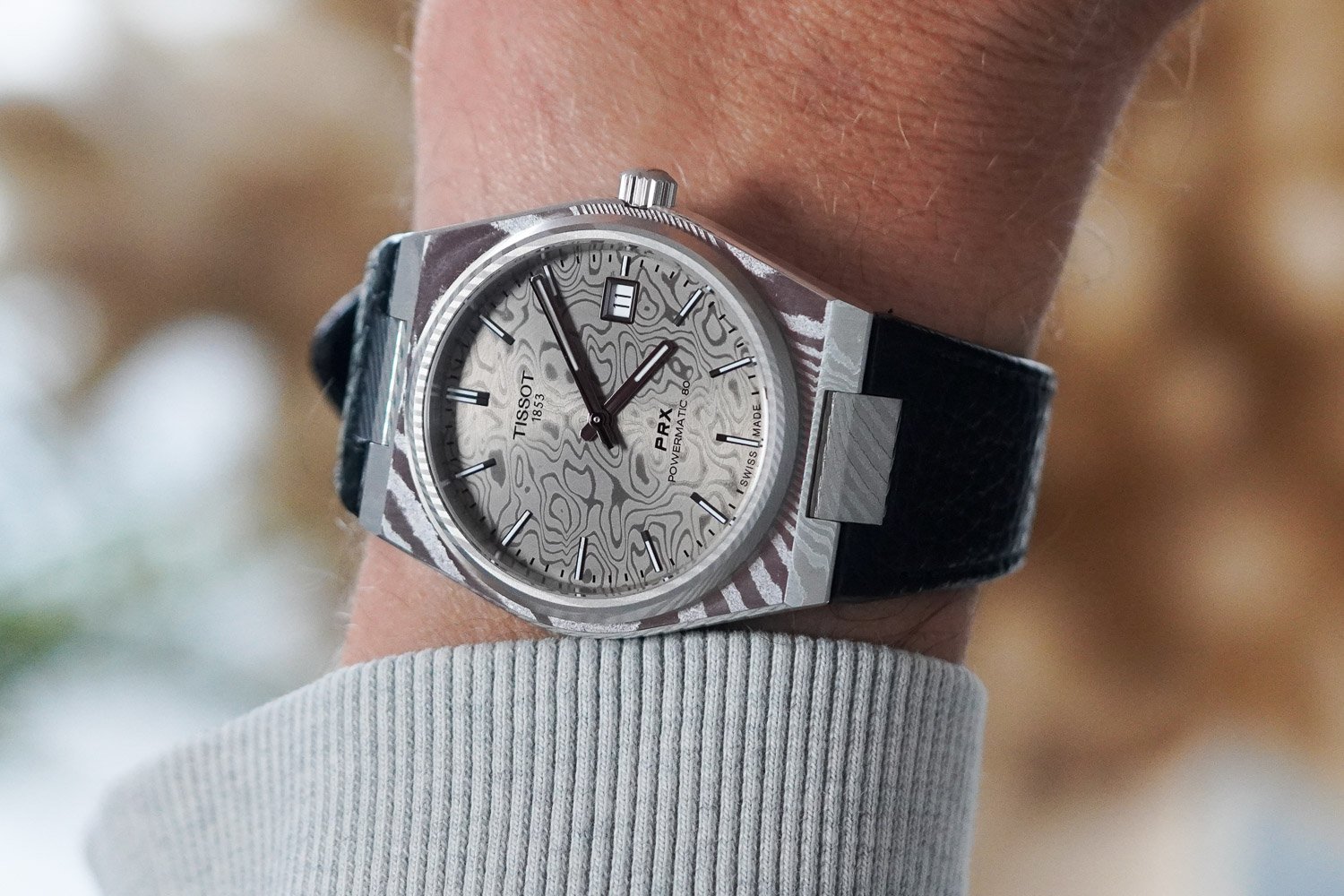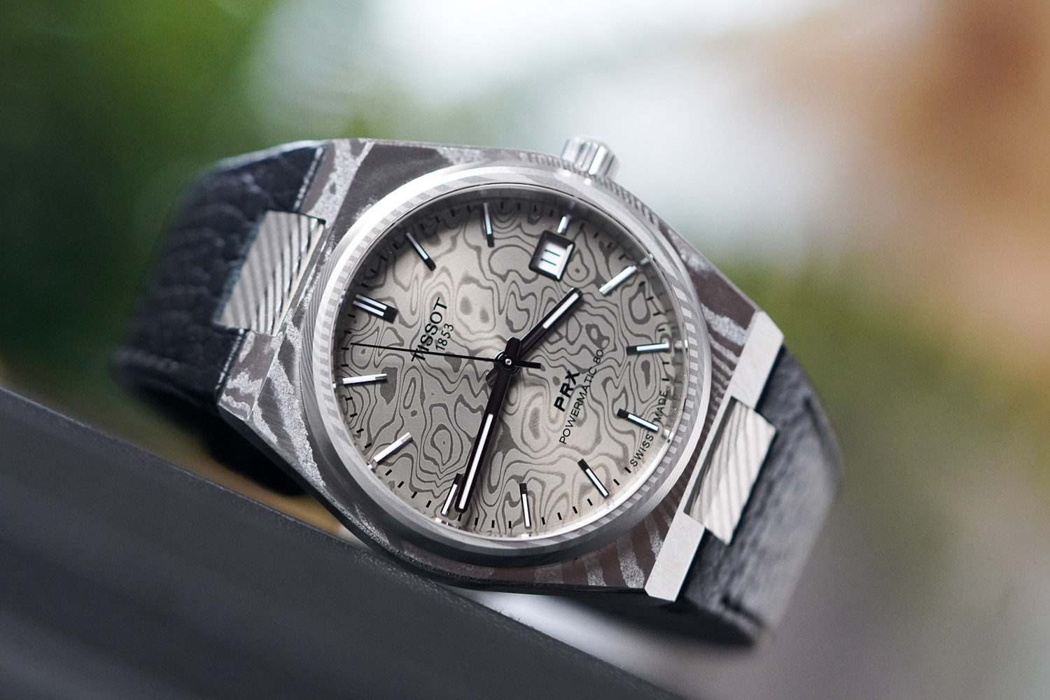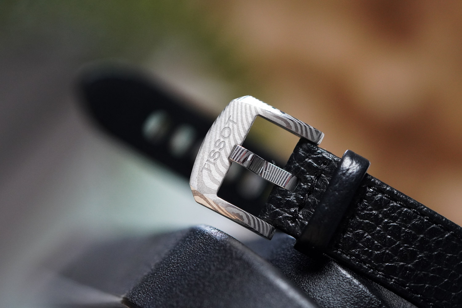 La grande surprise vient toutefois du modèle en acier de Damas. D’un simple coup d’œil, on comprend que Tissot a pris un risque stylistique tout comme elle l’avait fait avec la référence T137.907.97.201.00 en carbone. Les motifs ondulés, obtenus par la superposition et torsion de couches métalliques, donnent au boîtier une personnalité radicale, presque sculpturale. Je pensais à un gimmick, un exercice décoratif sans profondeur et c’est au final tout l’inverse. Cette montre a une présence folle, une gueule comme on dit – un caractère qui divise, et c’est précisément ce qui la rend intéressante. Impossible d’être tiède face à elle.