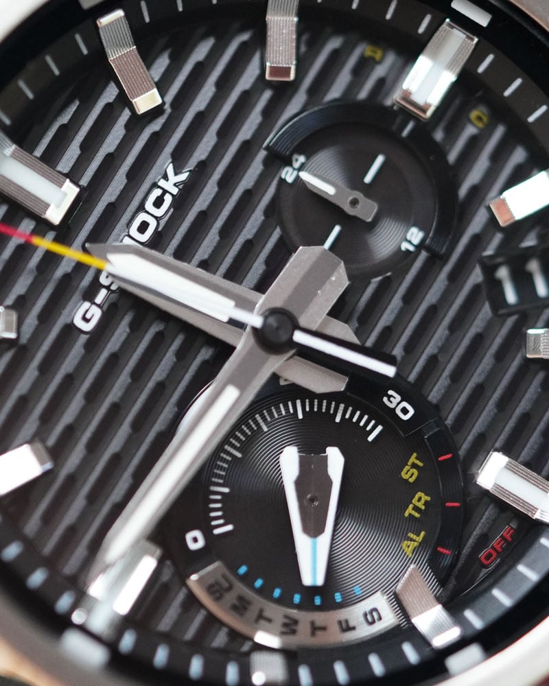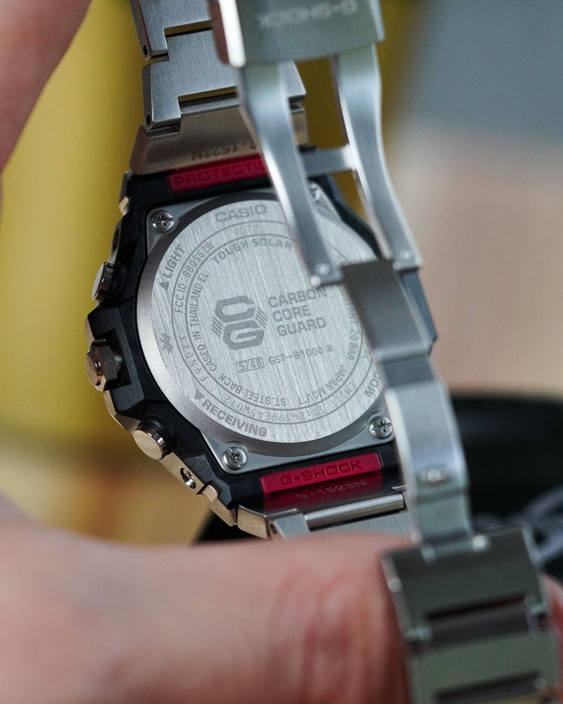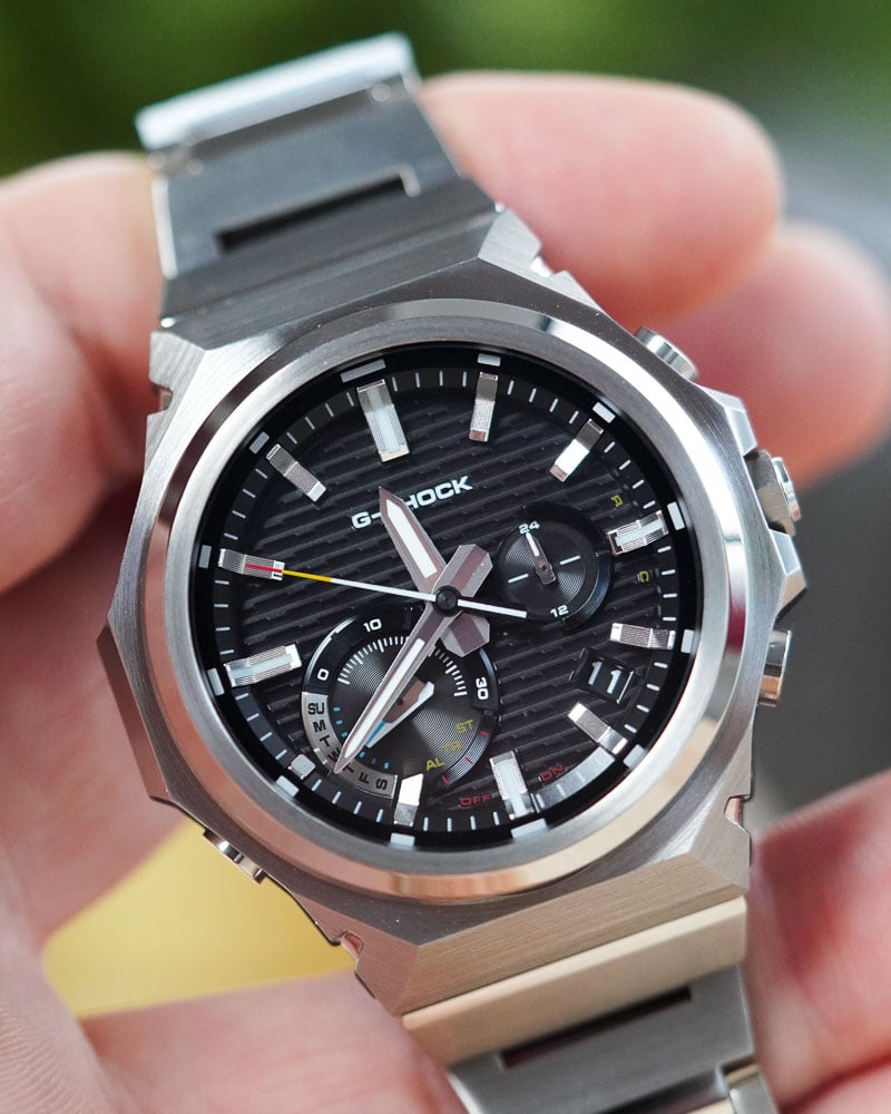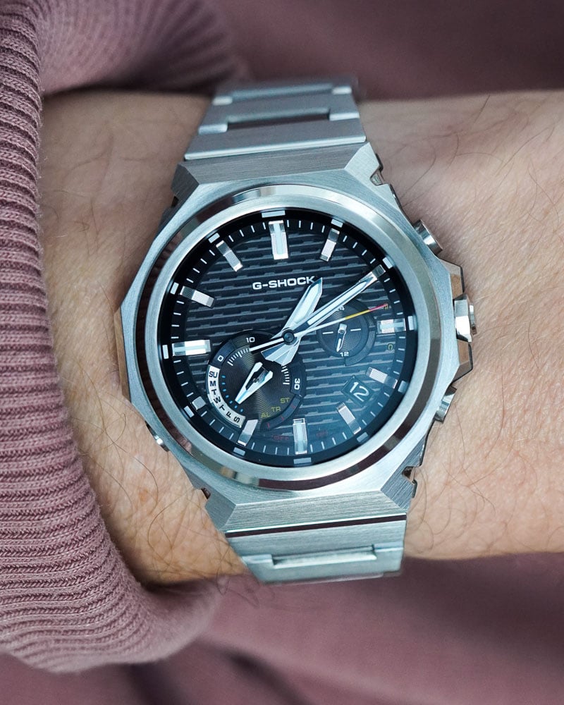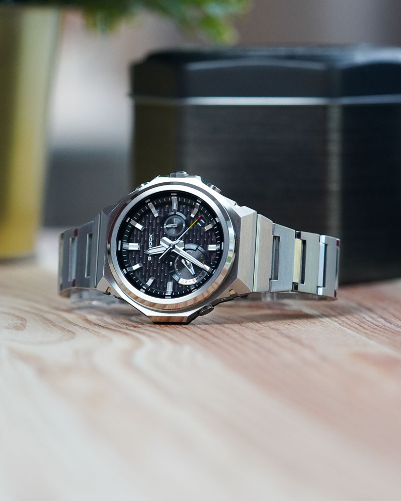 En main, cette version GST-B1000D-1A surprend immédiatement par son format. Ses 44,4 mm annoncés pourraient laisser penser à une montre imposante, mais son secret réside dans sa compacité. Avec seulement 46,9 mm de longueur corne à corne et un dessin latéral très travaillé, elle se pose naturellement sur un poignet de 17 cm, donnant l’impression d’une montre sous les 40 mm. Ses « oreilles » latérales, typiques des G-SHOCK métalliques, renforcent encore cette perception d’intégration et l’ouverture de cadran ne trompe pas. C’est ce qui lui permet d’entrer dans une catégorie rare : celle des G-SHOCK que l’on peut réellement porter en “daily”, y compris avec une chemise.