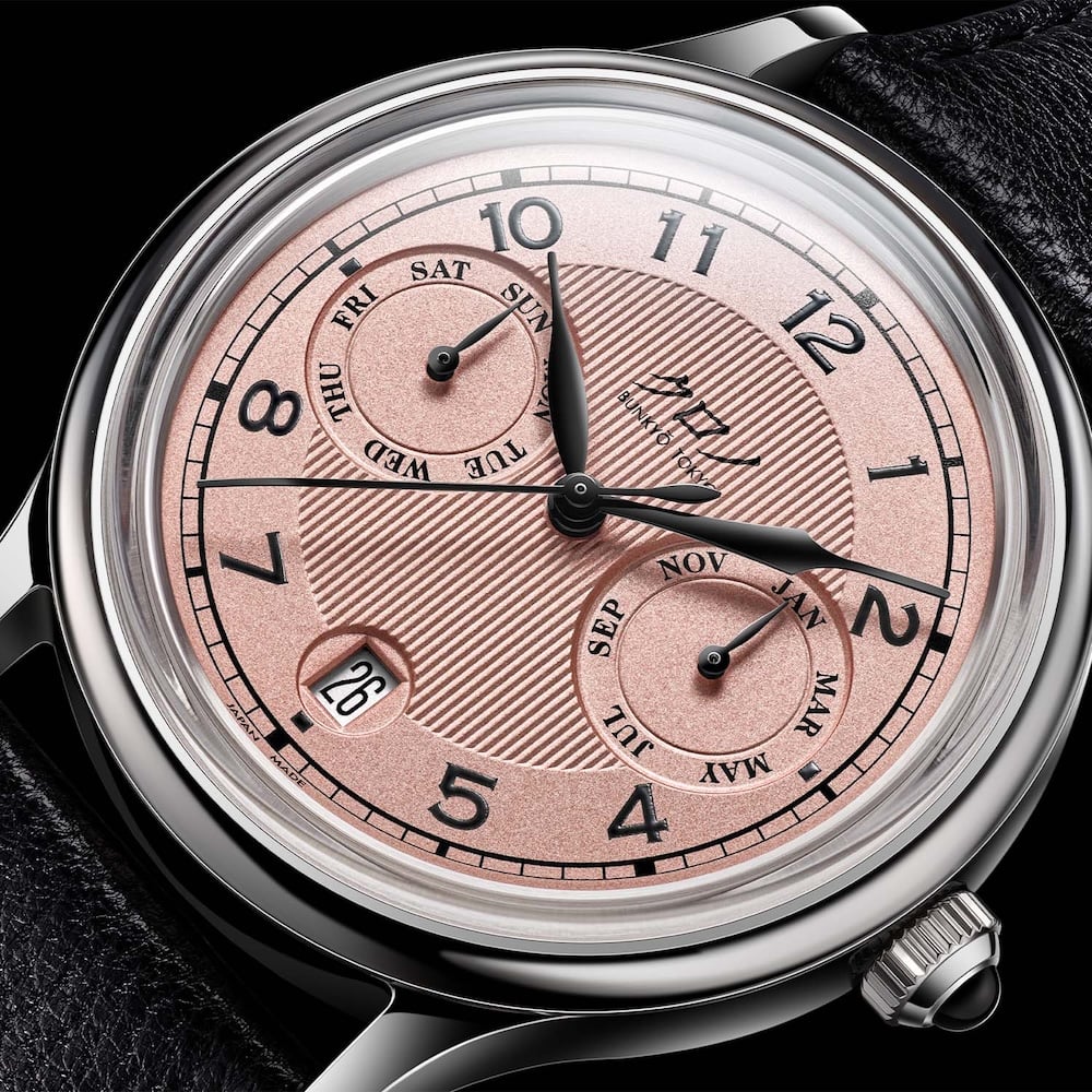 Le choix du cadran saumon n’est pas qu’une question de mode : il s’inspire d’une vision automnale de Tokyo, quand les feuilles rousses et orangées se mêlent à la lumière froide du matin. Sur ce fond délicatement texturé, les chiffres arabes et le chemin de fer noirs offrent un contraste parfait, tandis que les aiguilles bombées traitées dans une teinte onyx apportent une superbe profondeur. Le guilloché vertical, déjà utilisé sur certaines créations plus haut de gamme d’Asaoka, renforce cette continuité esthétique entre les pièces d’atelier et la ligne Kurono Tokyo.