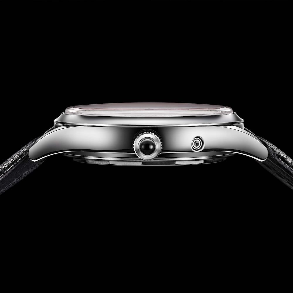 Le cadran présente des sous-compteurs encastrés pour le jour et le mois, créant un effet de relief intéressant captant l’ombre et la lumière. Cette construction complexe permet de renforcer la profondeur visuelle sans sacrifier la lisibilité. La couronne elle, sertie d’un cabochon en onyx, ajoute une touche de distinction parfaitement en phase avec l’esprit du jubilé.
