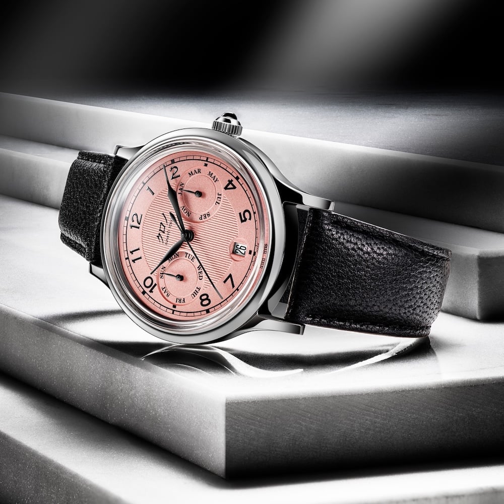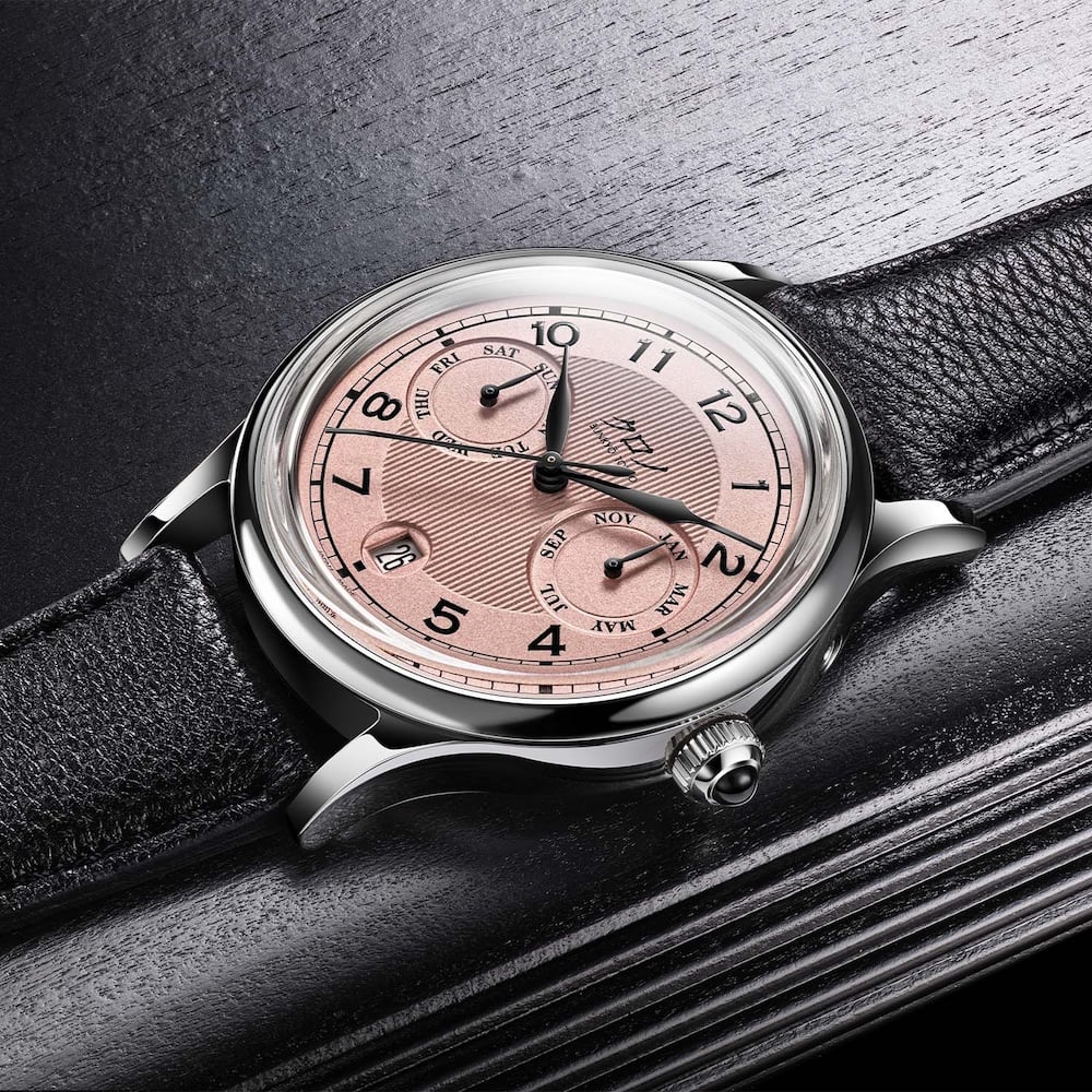 La disposition du triple calendrier reste classique : un guichet de date à 6 h, accompagné de deux sous-cadrans en creux pour le mois et le jour. L’ouverture du guichet est encadrée dans un léger renfoncement circulaire, un détail qui permet de minimiser l’épaisseur visuelle du cadran tout en optimisant la lisibilité — un travail de design plus subtil qu’il n’y paraît.