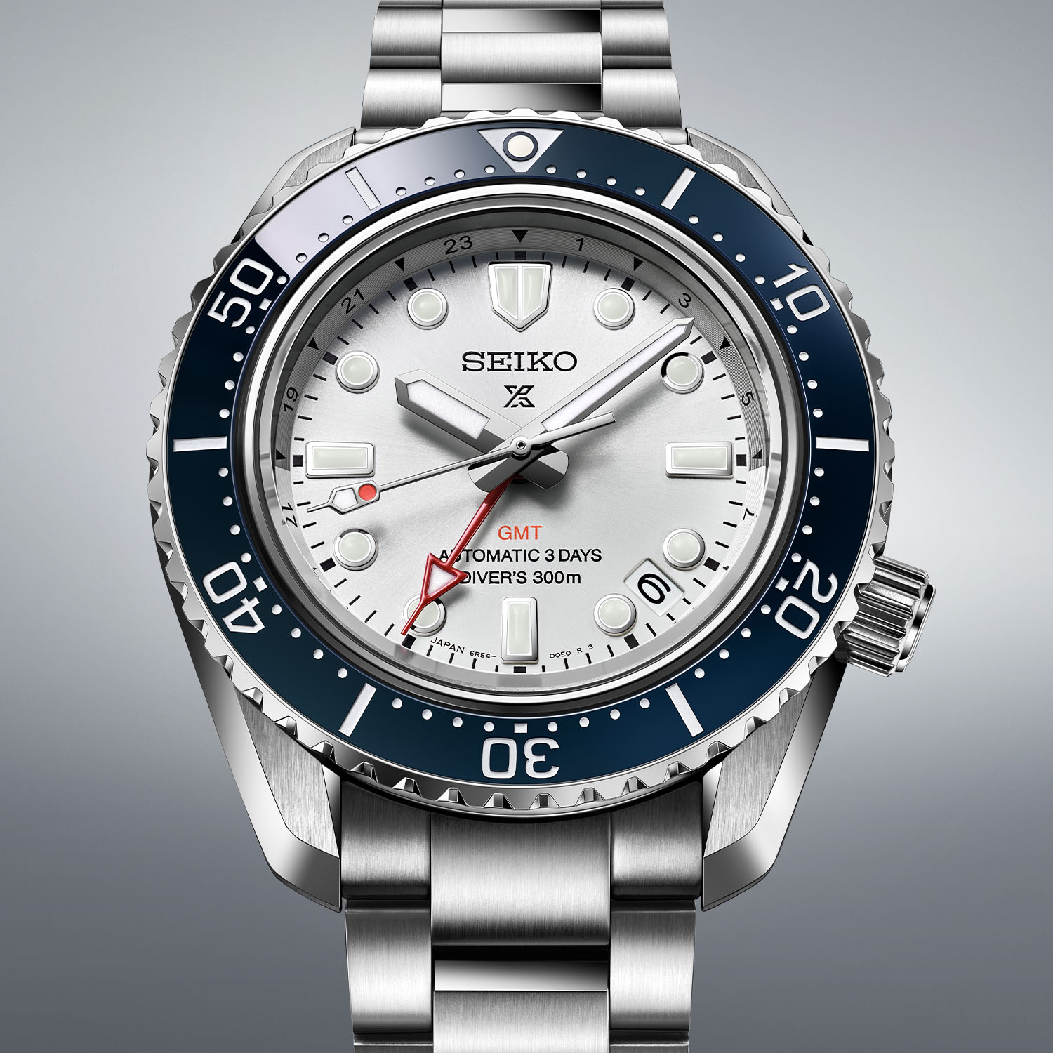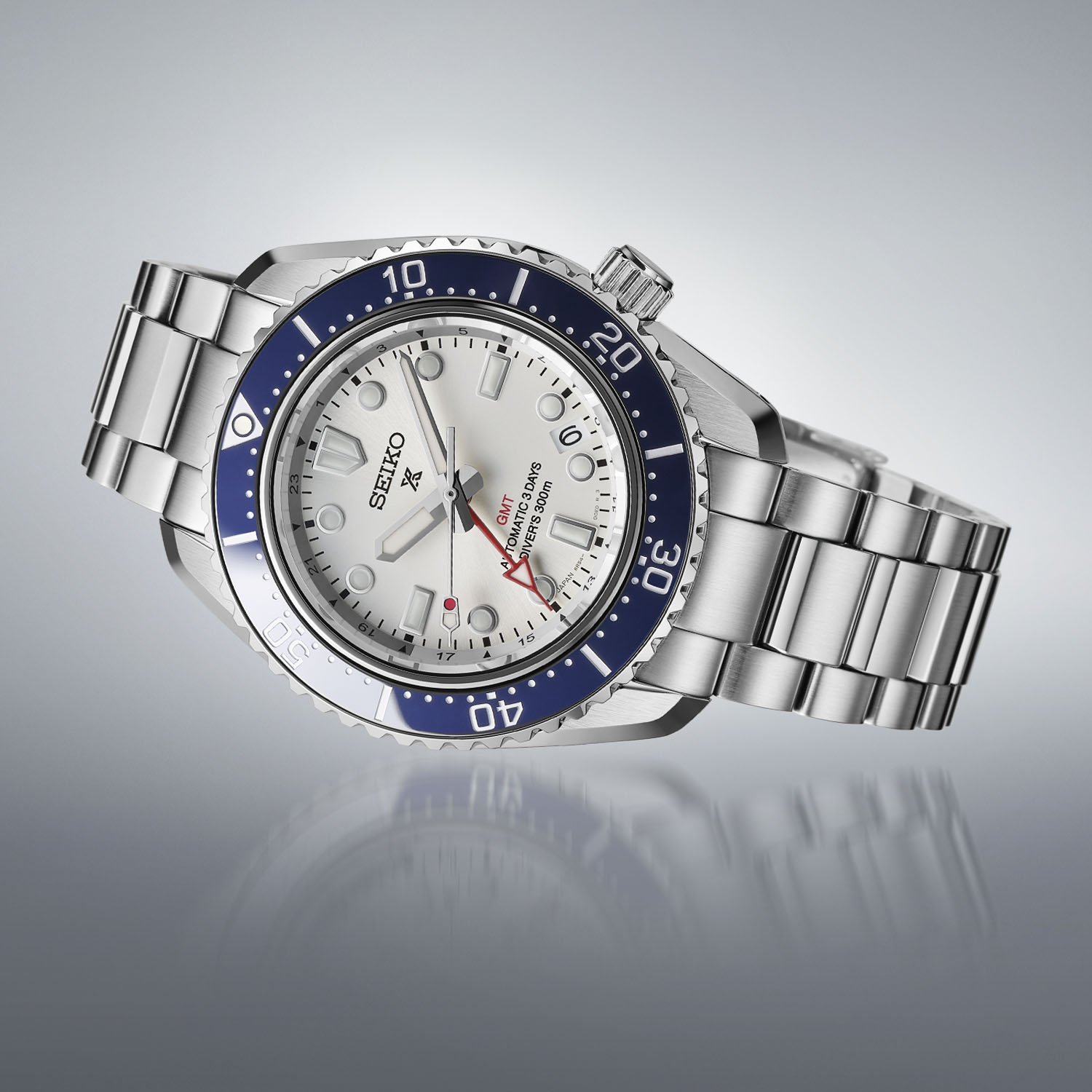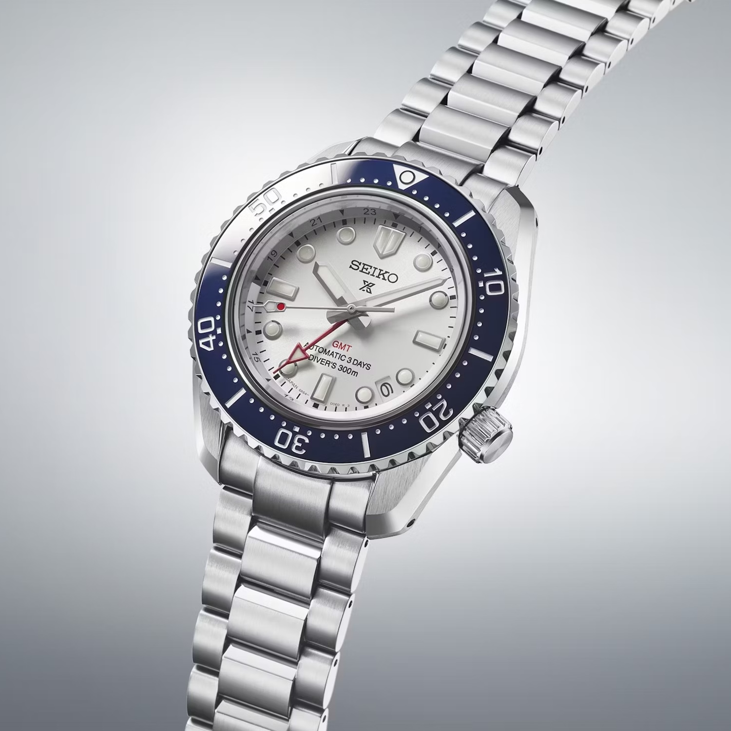 La Seiko SPB519 adopte un boîtier en acier inoxydable renforcé (revêtement “super-dur” de la marque) de 42 mm de diamètre pour 13,3 mm d’épaisseur, avec un fond plein et une couronne vissée positionnée à 4 heures, signature de la maison. Son design s’inspire directement de la 6159 d’origine, tout en apportant plus de finesse et de confort au poignet. La lunette tournante unidirectionnelle, dotée d’un insert en céramique, est bleu marine, tandis que la distinction entre jour et nuit pour la fonction GMT s’opère sur le rehaut (blanc et gris). La montre embarque le calibre 6R54, un mouvement automatique maison offrant 72 heures de réserve de marche. Contrairement à la majorité des montres GMT d’entrée de gamme, la SPB519 est une véritable “traveler’s GMT” : l’aiguille des heures locales est indépendante, ce qui facilite les réglages lors des déplacements. Le cadran blanc tire sur l’argenté et arbore une finition soleillée, avec des index appliqués généreusement remplis de Lumibrite, tout comme les aiguilles, garantissant une excellente lisibilité dans l’obscurité. L’ensemble est protégé par un verre saphir avec traitement antireflet interne et la montre affiche une étanchéité à 300 mètres, dépassant donc la norme ISO pour les montres de plongée.