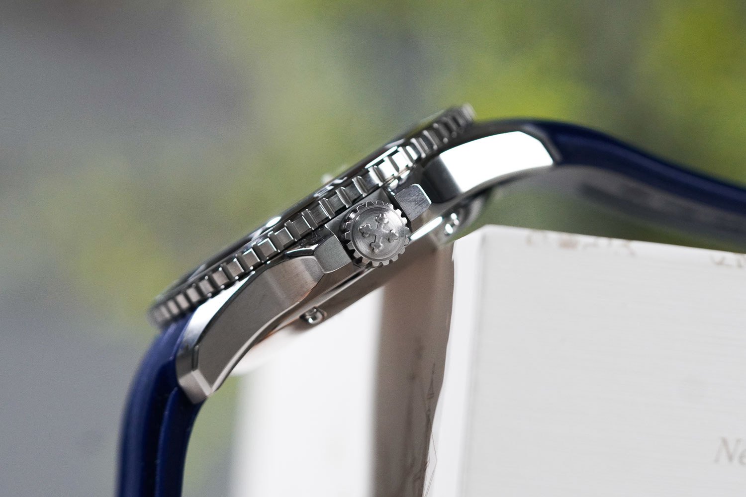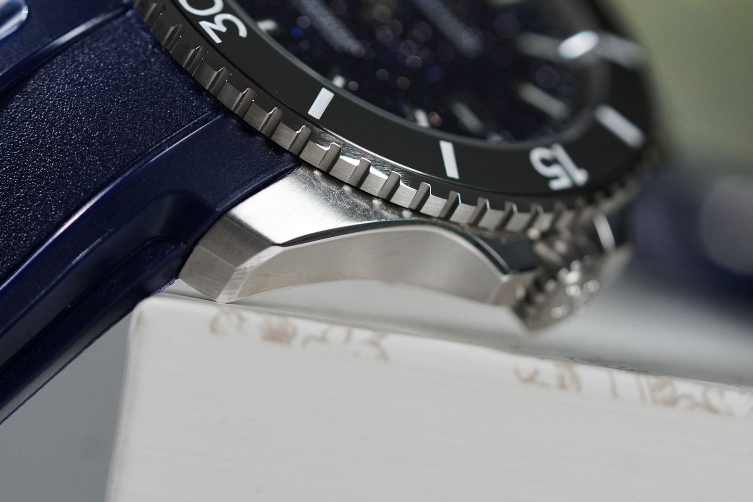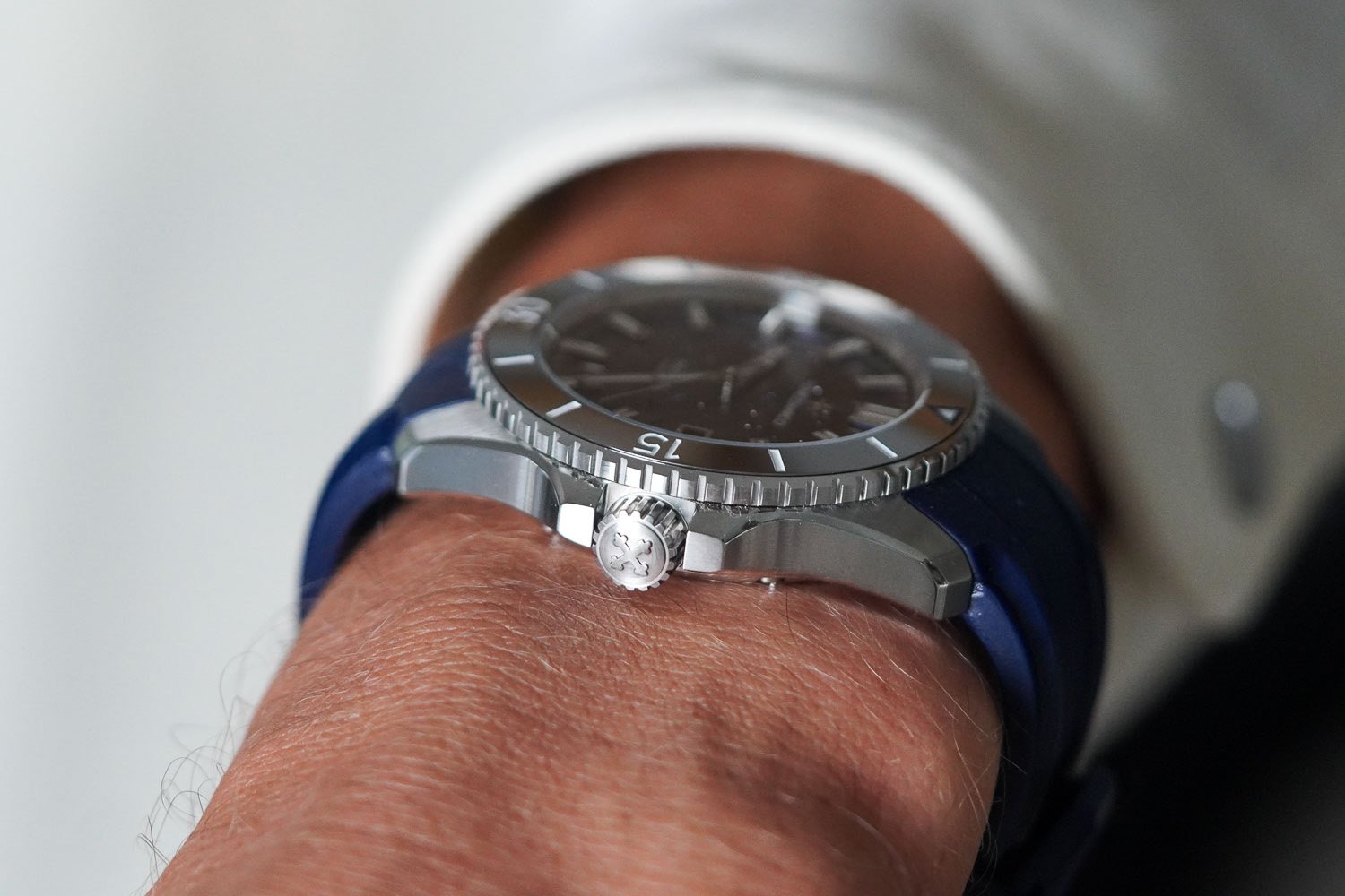 Sous cet éclat visuel, le boîtier en acier inoxydable de 42 mm de diamètre pour 49 mm de longueur et 12,5 mm d’épaisseur, conserve les proportions équilibrées et la géométrie reconnaissable de la collection, avec une lunette unidirectionnelle en tungsten poli résistant aux rayures puis un verre saphir traité anti-reflet. L’ensemble est à la fois robuste et raffiné, capable d’accompagner aussi bien un costume – notamment sur bracelet acier – qu’une combinaison de plongée.