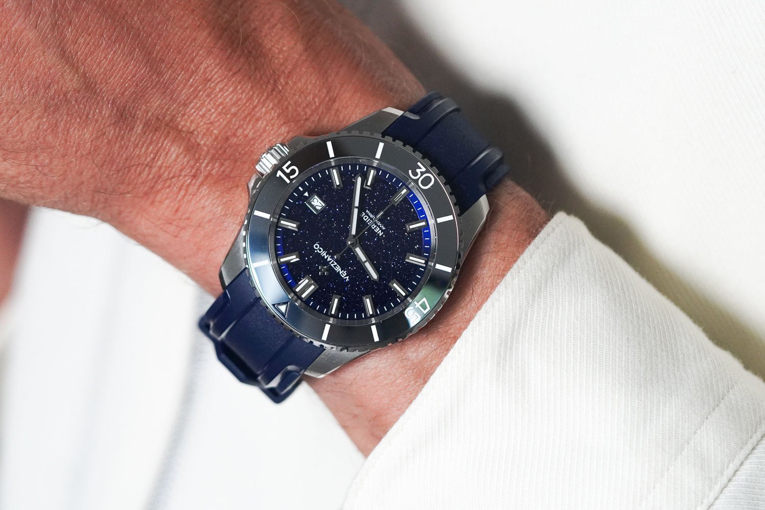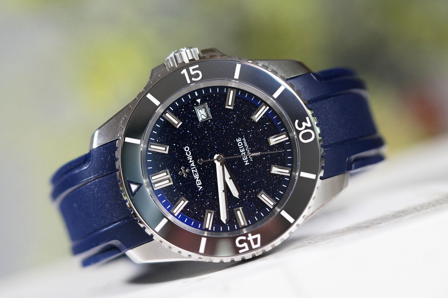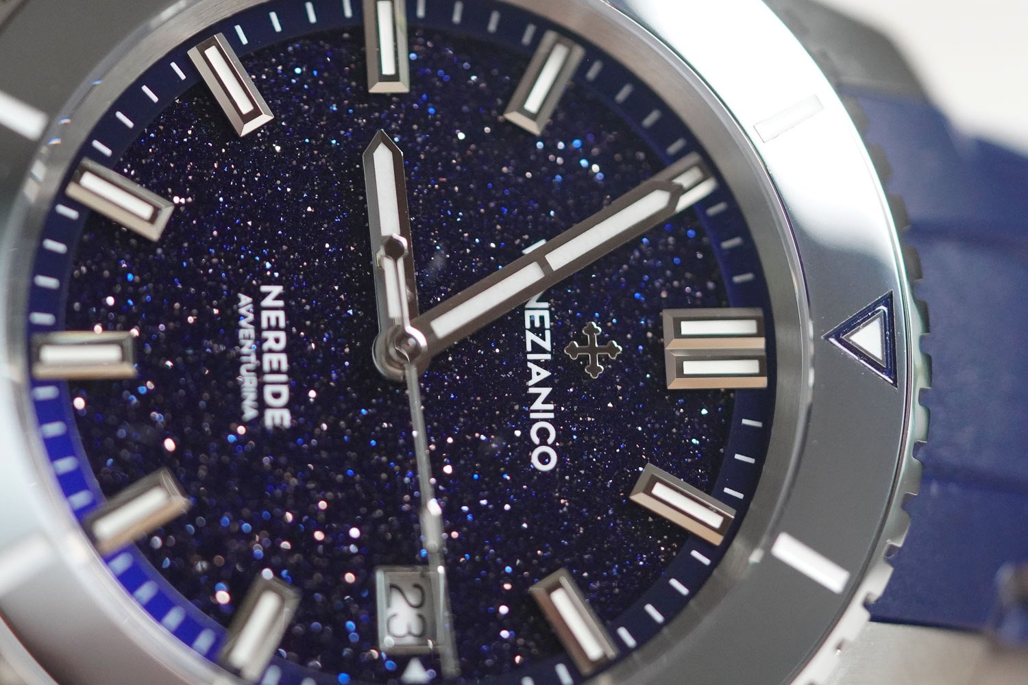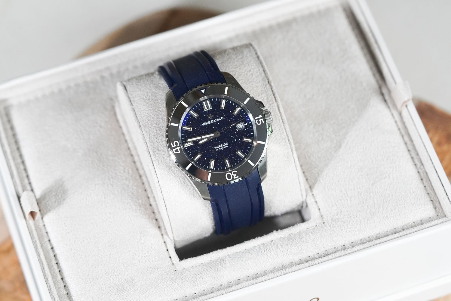 Nommée d’après le sous-marin italien Nereide de 1913, cette collection est la pierre angulaire de la marque. Elle résume tout ce que Venezianico sait faire : des montres sportives à l’ADN marin, pensées pour la vie de tous les jours autant que pour les profondeurs. Depuis ses débuts, la Nereide a connu de multiples déclinaisons, mais cette version Avventurina pousse l’exercice plus loin en injectant une dose de poésie cosmique dans le monde des montres de plongée. Avec son cadran en pierre d’aventurine bleue, chaque pièce est unique, parsemée de paillettes évoquant d’une certaine manière le ciel nocturne vénitien.