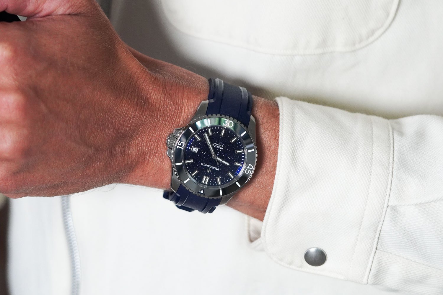 Sur le plan esthétique, difficile de rester indifférent. L’aventurine est un matériau souvent réservé à des montres beaucoup plus chères, et Venezianico parvient à la mettre en valeur sans en faire trop. Le rendu varie selon la lumière : parfois profond et mystérieux, parfois presque liquide. Cet effet visuel, allié à la lisibilité d’une vraie plongeuse (lunette crantée, index luminescents, étanchéité à 200 mètres), donne à la montre un caractère unique, véritablement sport-chic.