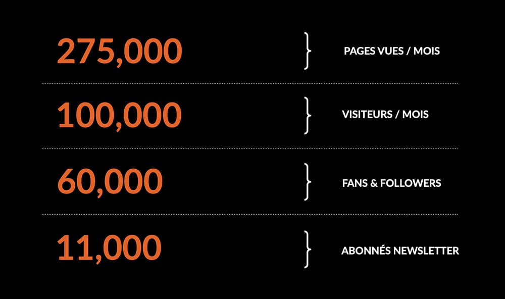 Contactez-nous afin d’obtenir notre kit média qui comporte plus de statistiques, une présentation détaillée de notre audience, les différentes options et formats publicitaires ainsi que les tarifs des différents partenariats. Véritable média agile, nous créons également des offres uniques en fonction de vos objectifs.